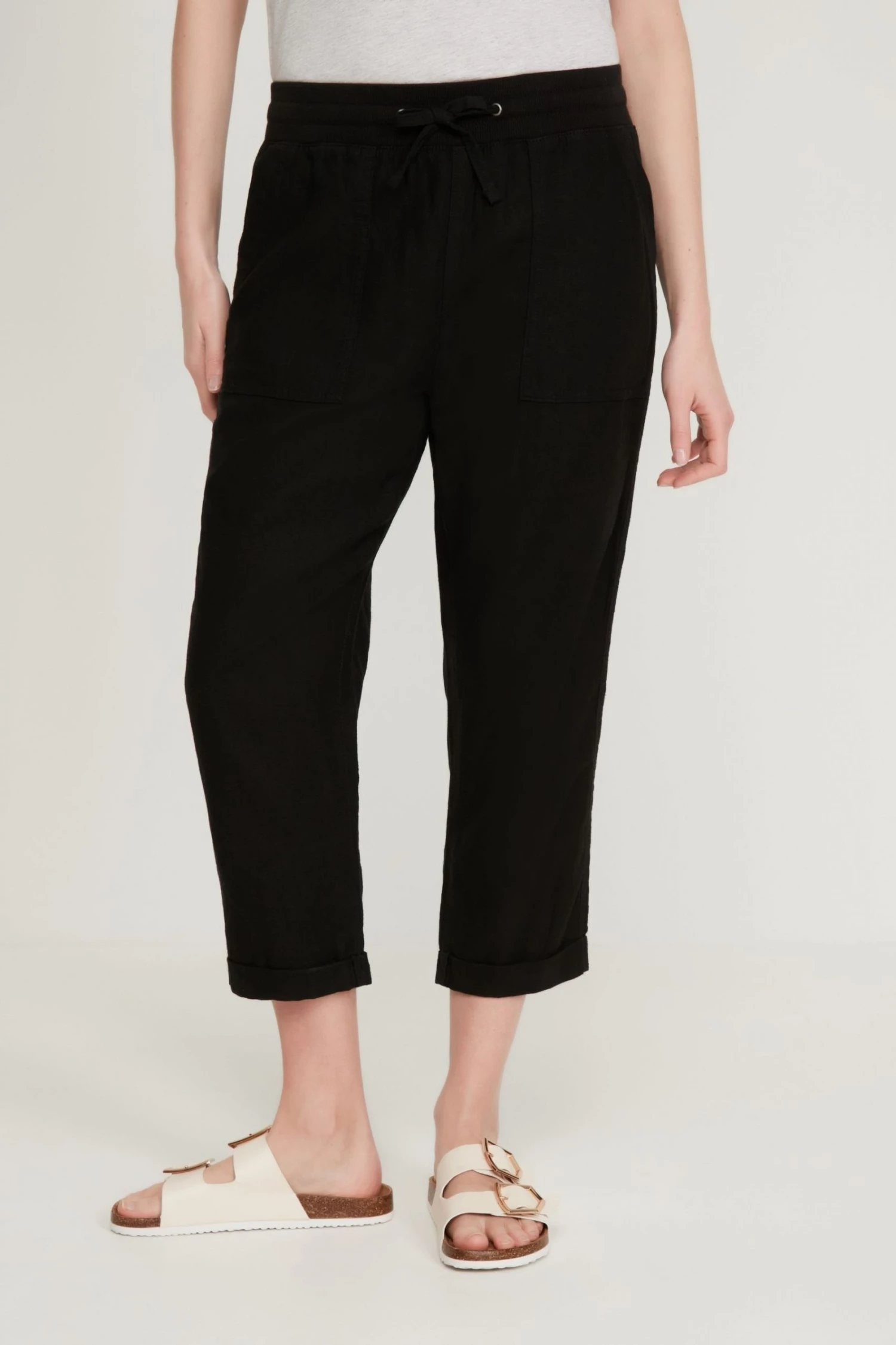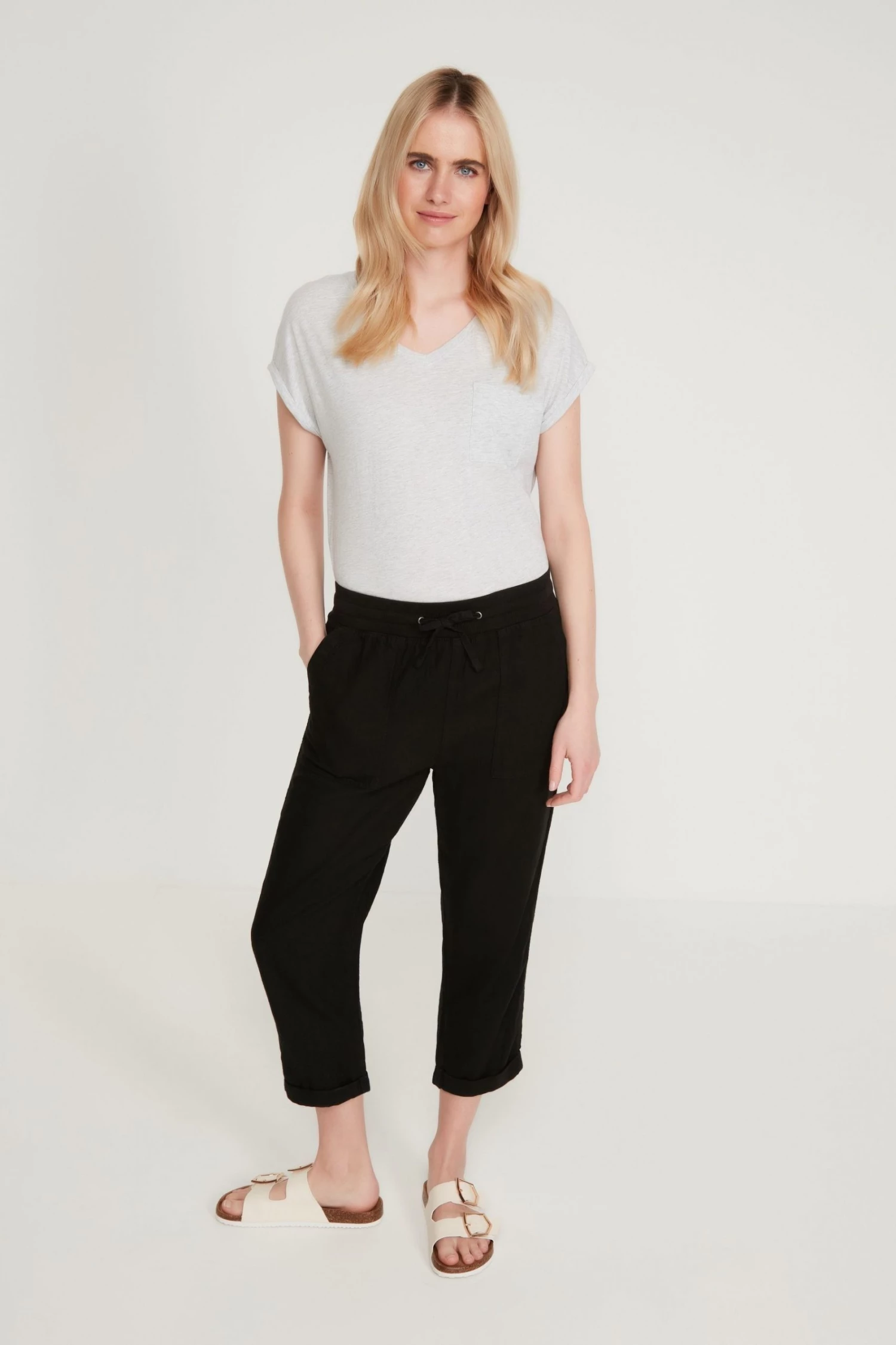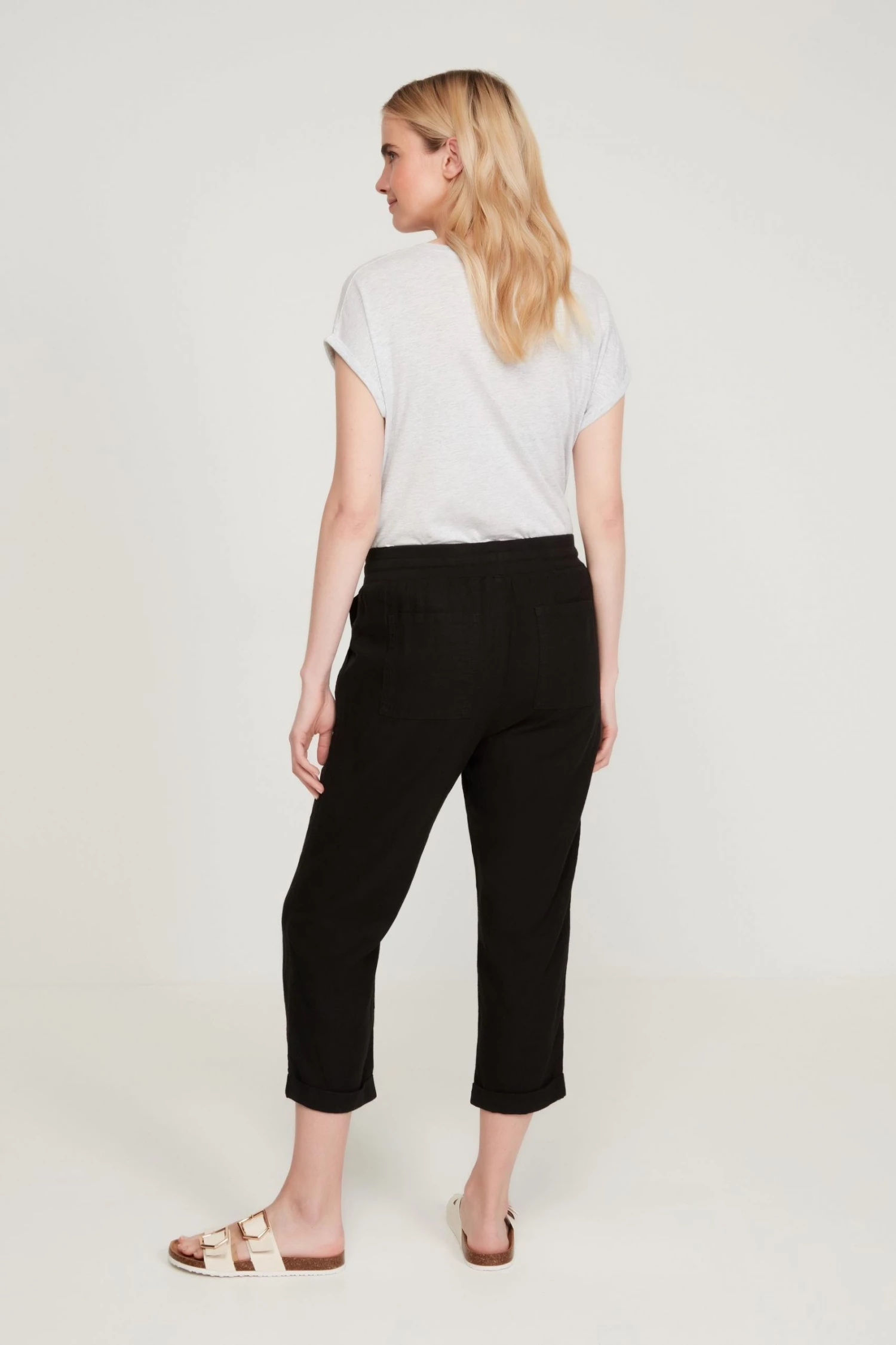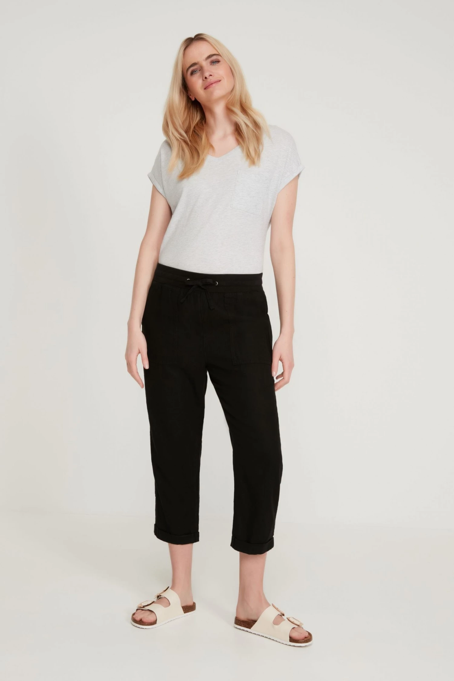 Update your wardrobe for the new season with these cropped trousers, featuring an elasticated waist with drawstring, cool linen fabric and a turn up hems. Pair with a T-Shirt and sandals for an easy summer look.