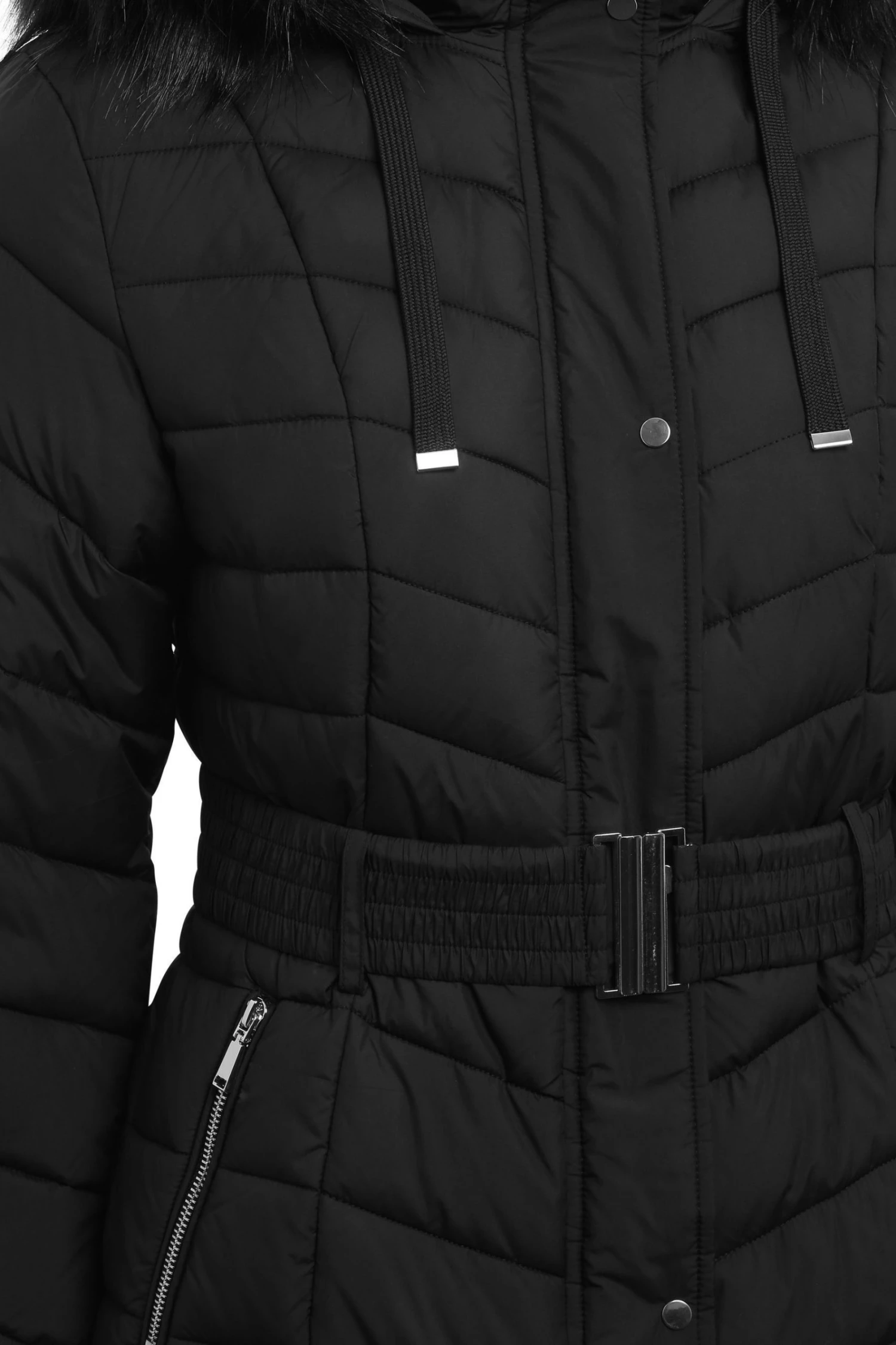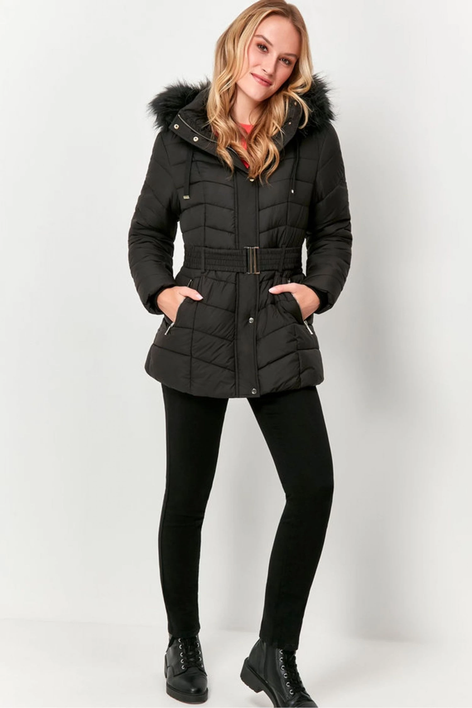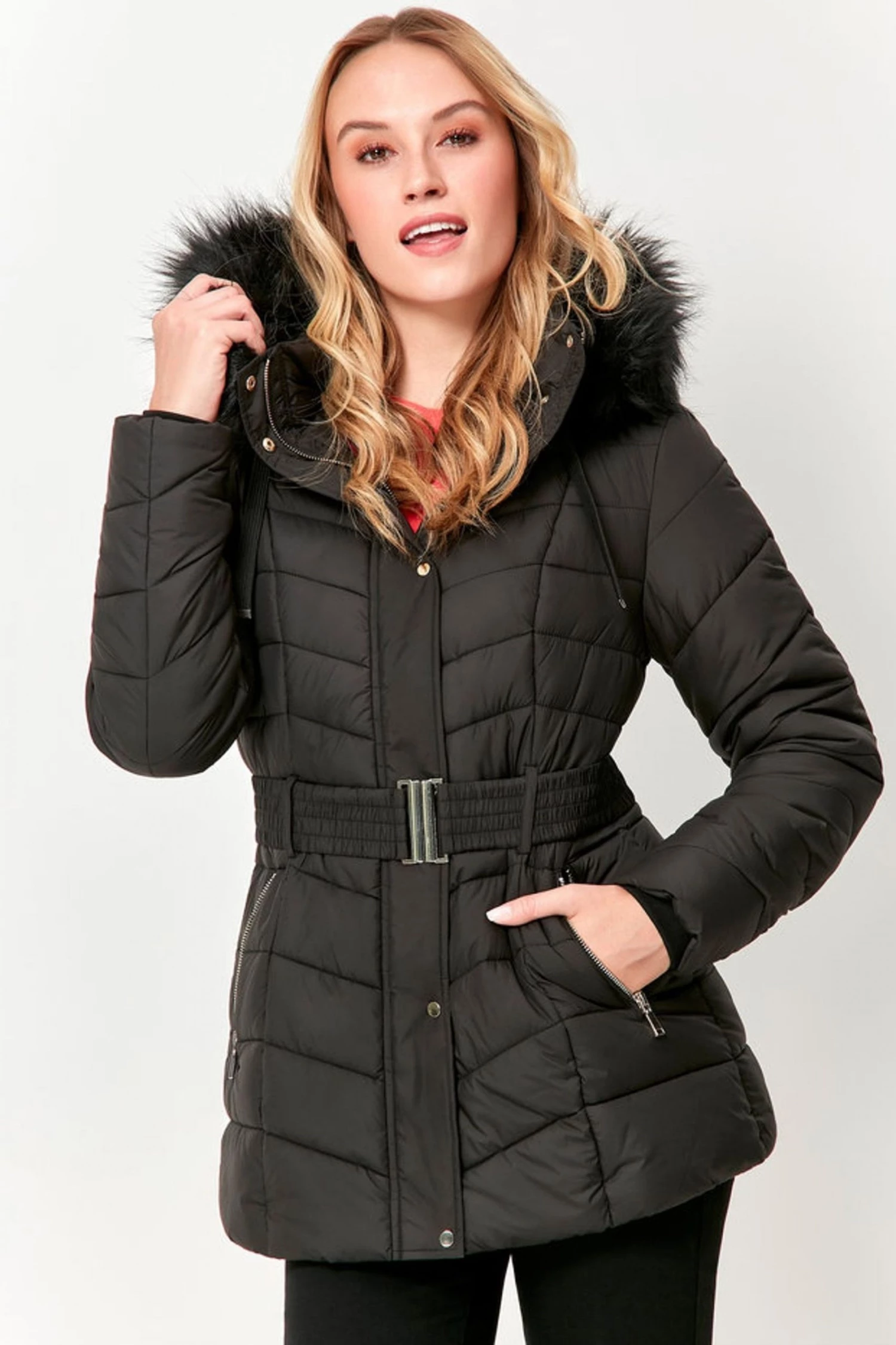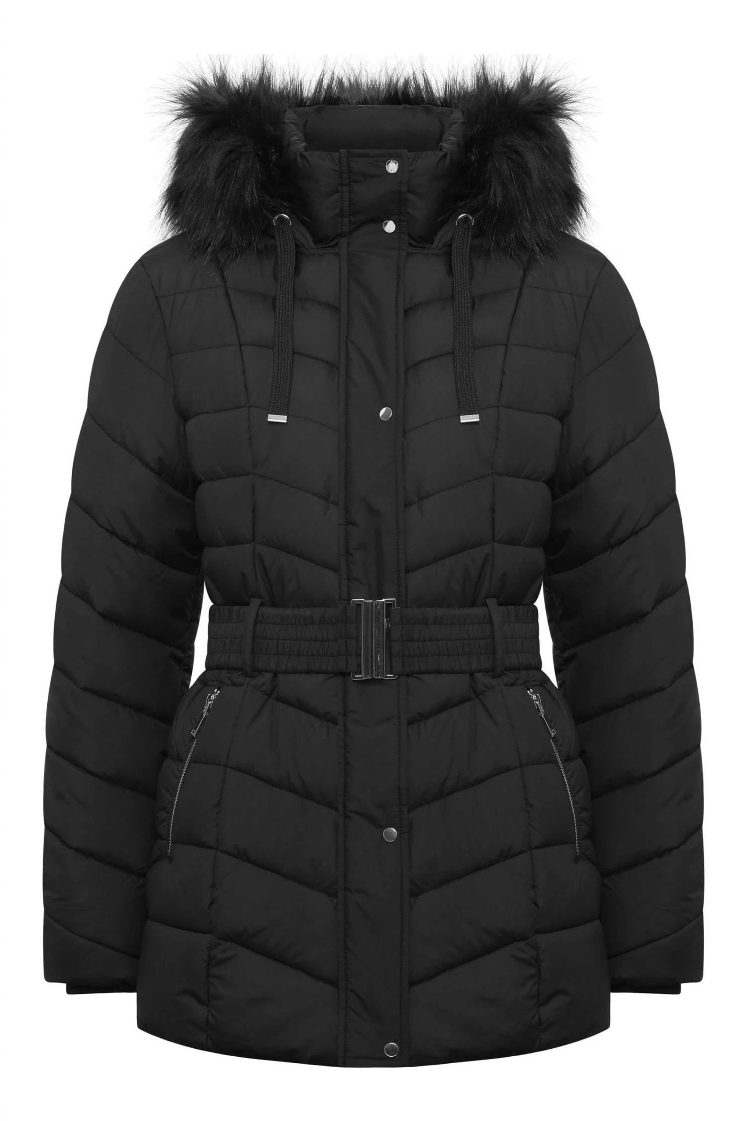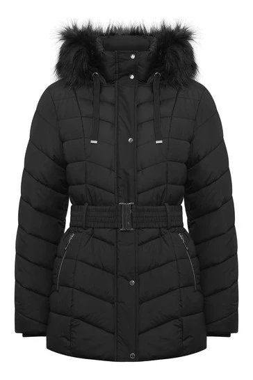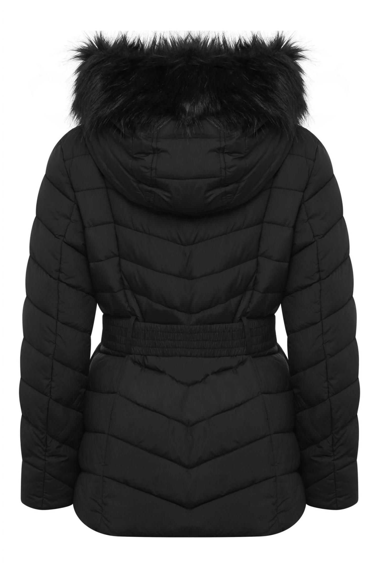 Prepare for the colder months with this cosy short puffer coat. This coat is shower resistant and features a shorter length, long sleeves, a faux fur hood and a full zip with additional belt detail.