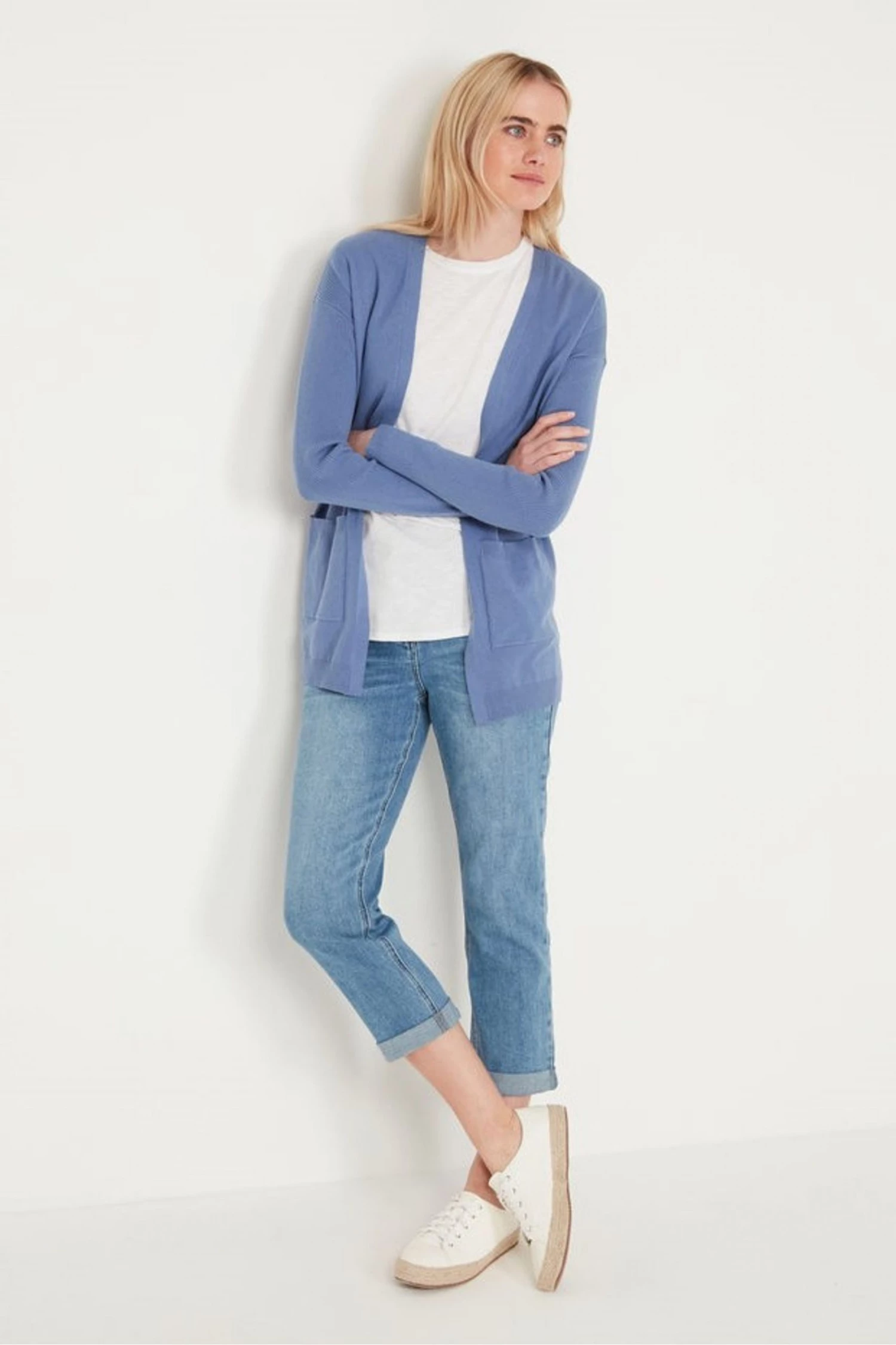 This cardigan features a cosy knitted fabric, long sleeves, an open front and blue design. Layer over a classic white T-shirt and jeans for the perfect spring look.