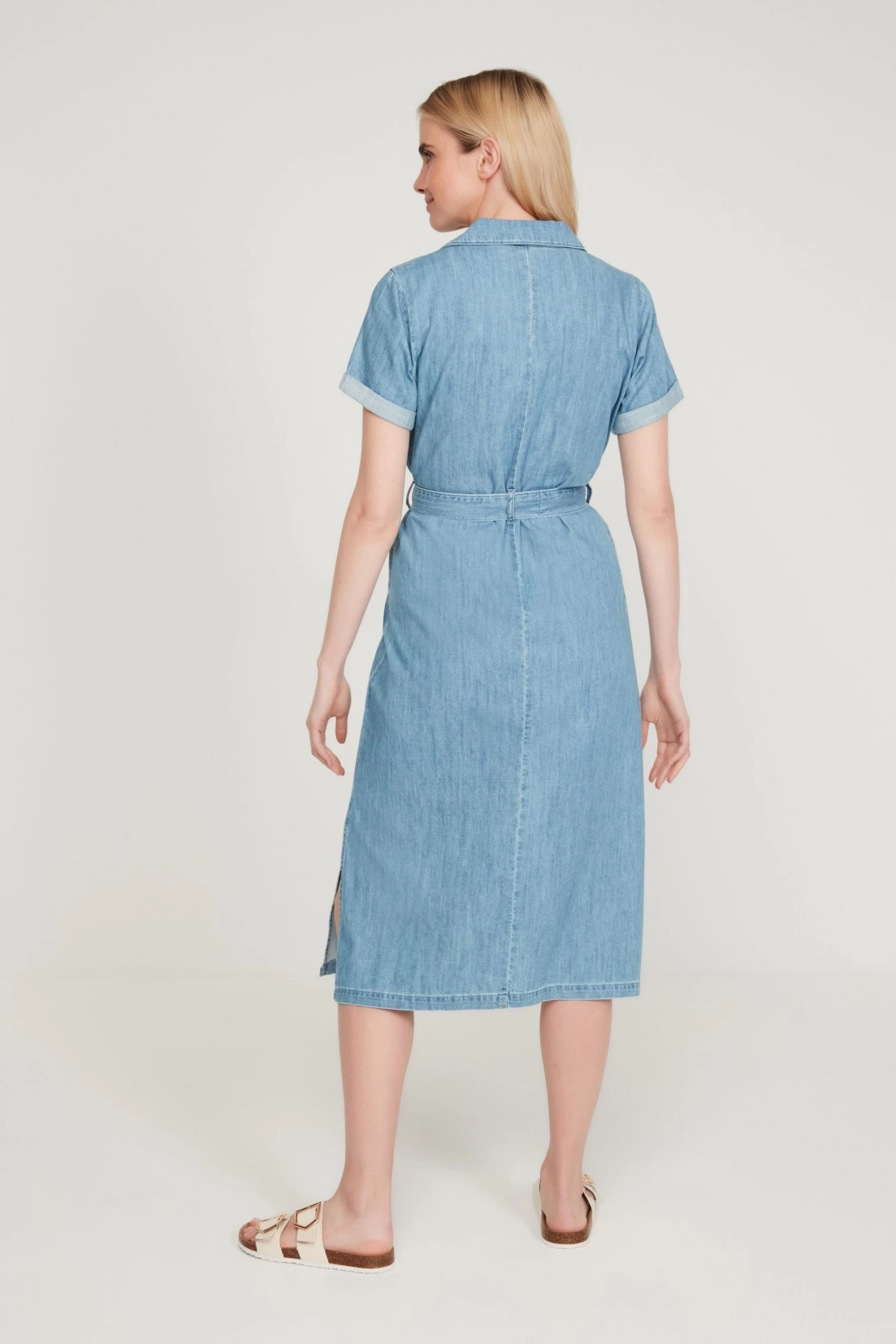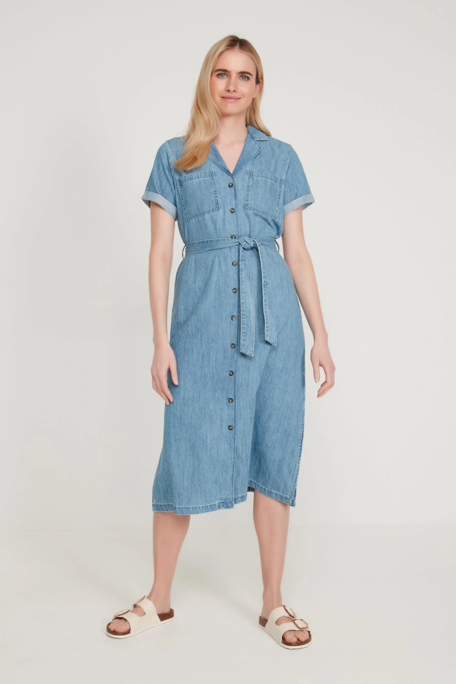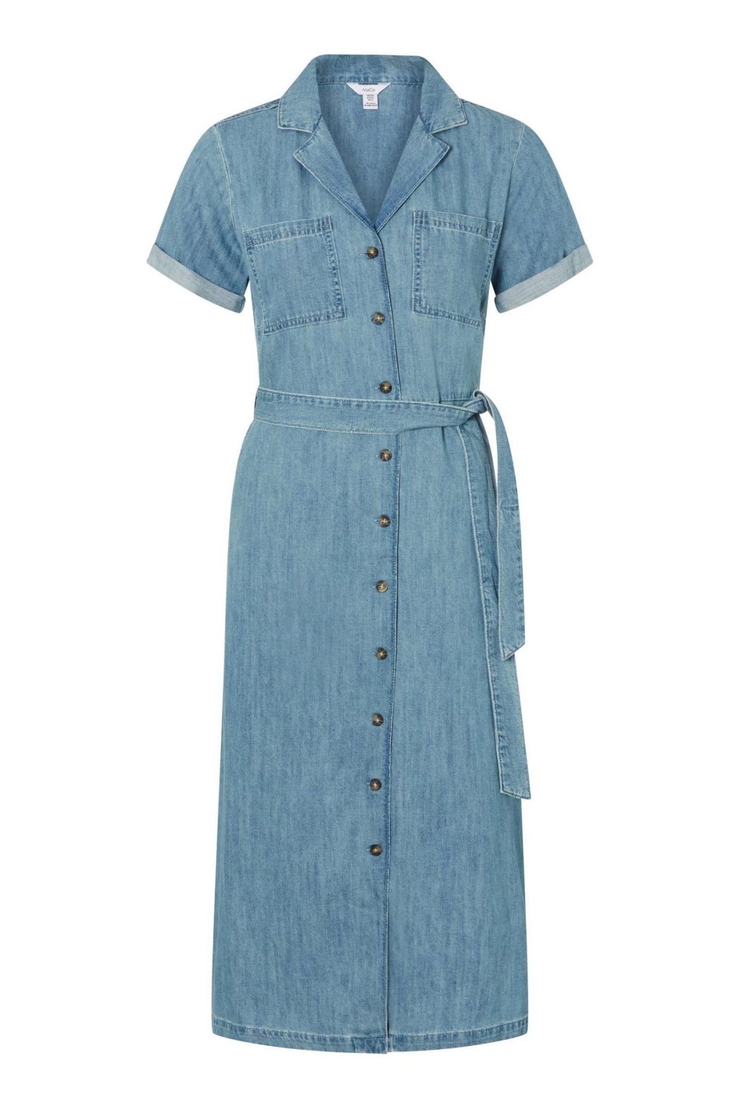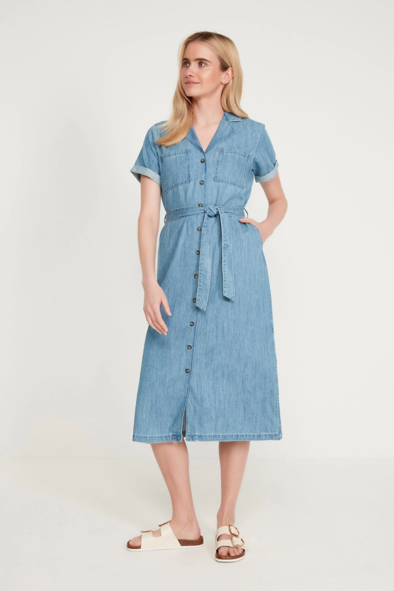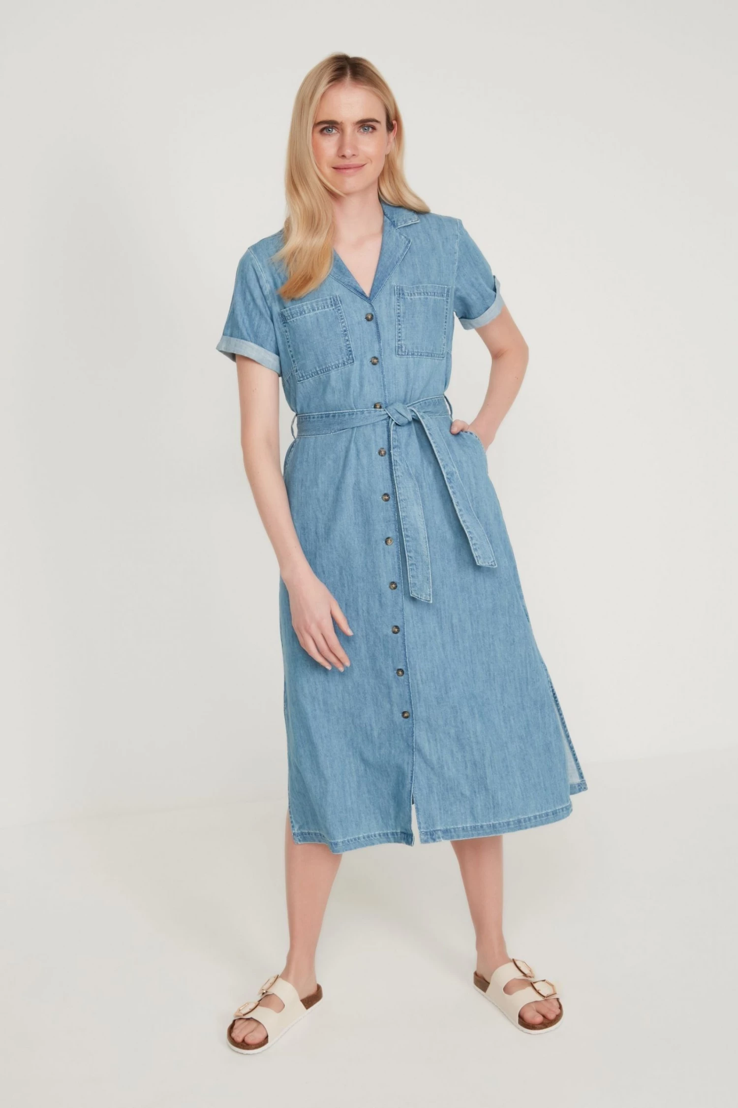 This denim dress is perfect for those warmer seasons. Featuring a button through front with a traditional shirt collar, a tie waistline, short sleeves and two chest pockets.