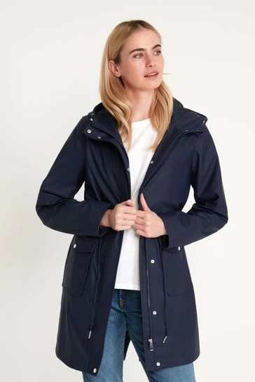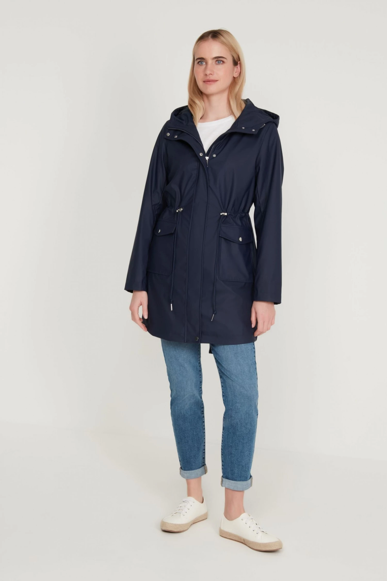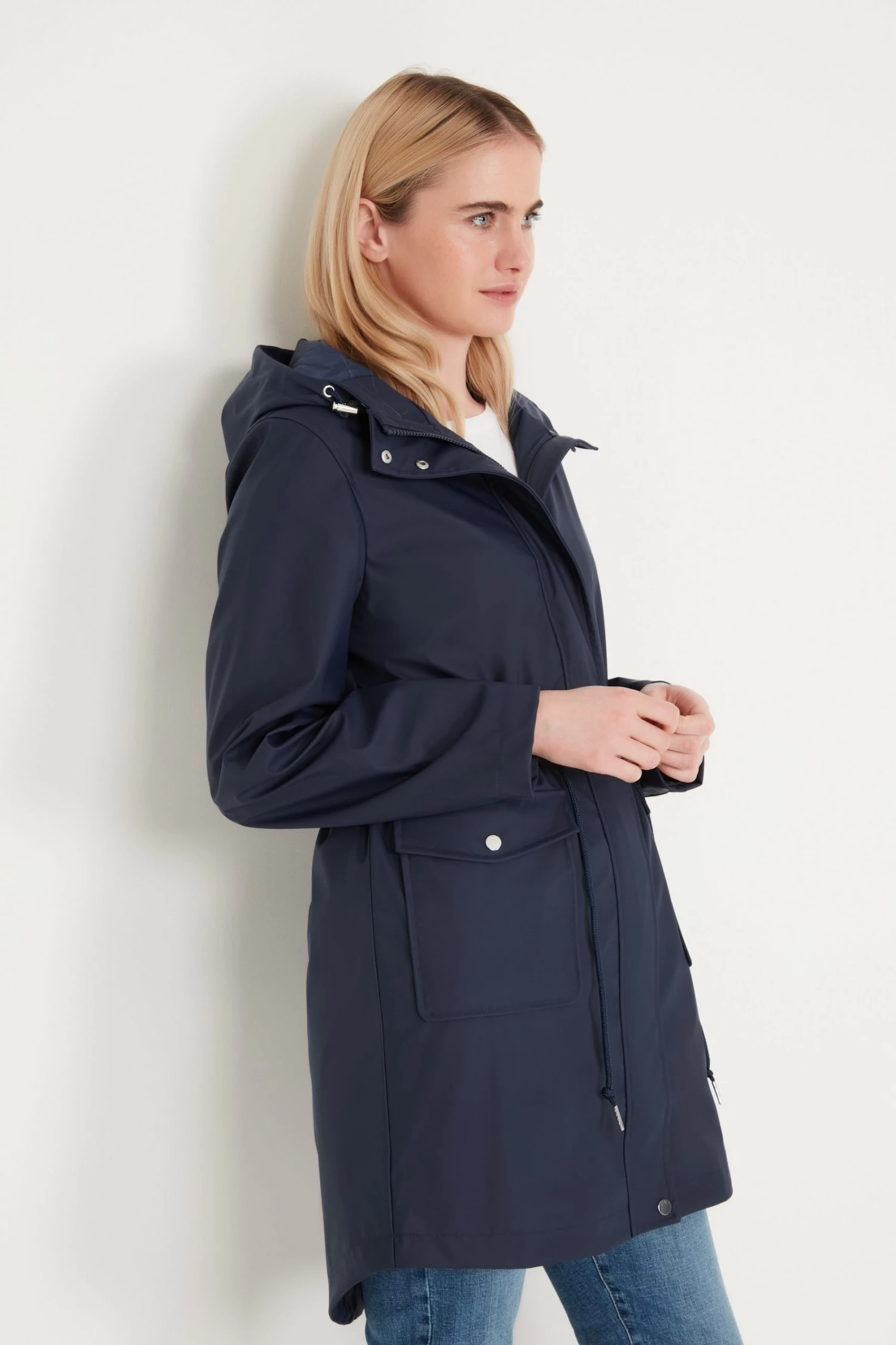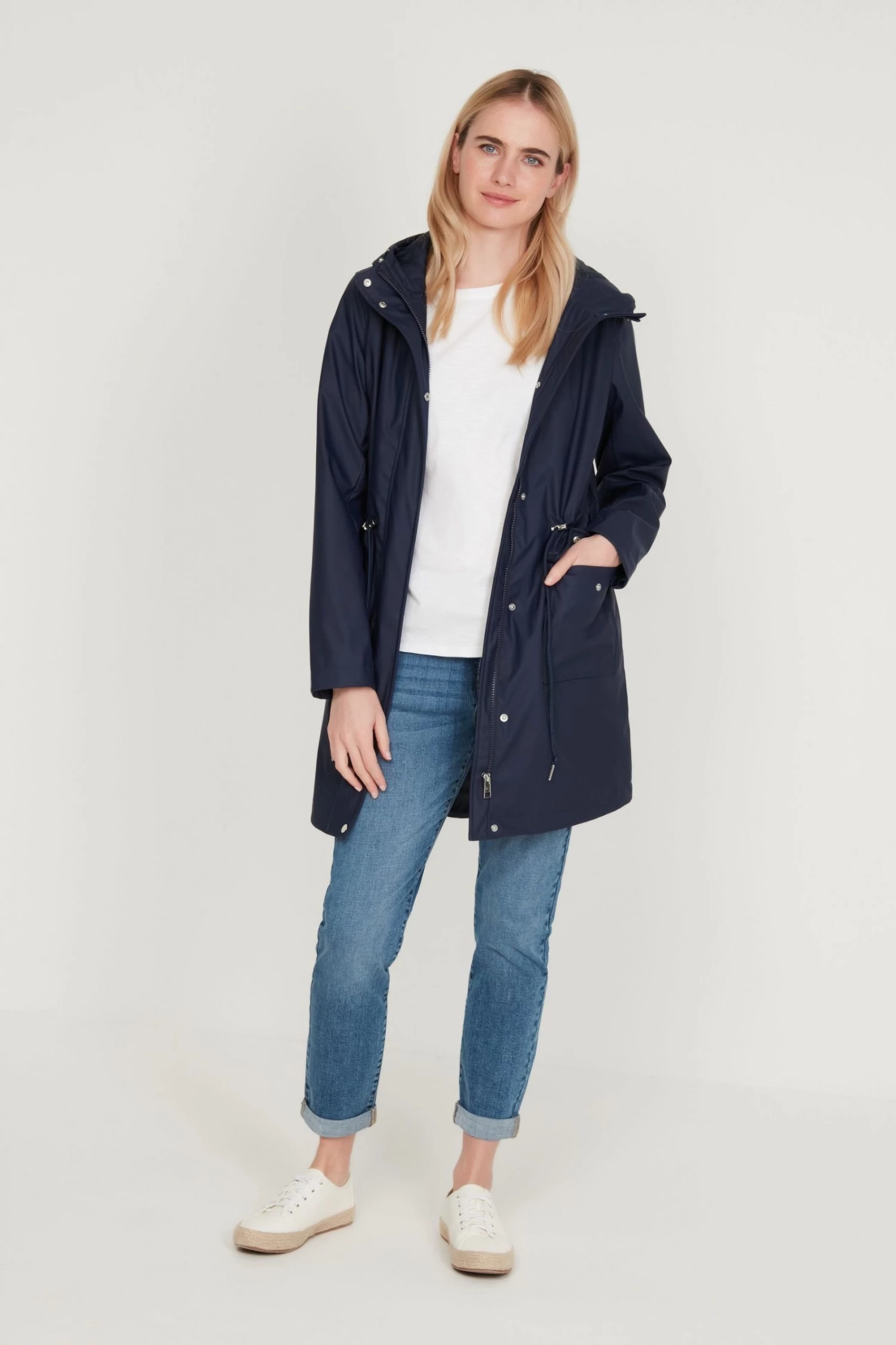 This raincoat is designed in a longline length and features a drawstring waist, long sleeves, classic hood, and side pockets with button closure. Layer over any outfit for an on-trend look, no matter the weather!