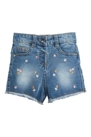 These girl’s mid wash denim shorts are cut to a short length and feature a button fastening and back pockets. The floral embroidery makes these shorts a must for her spring summer wardrobe.