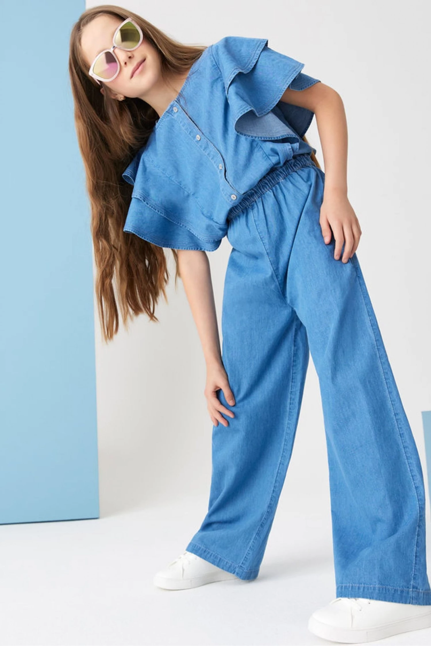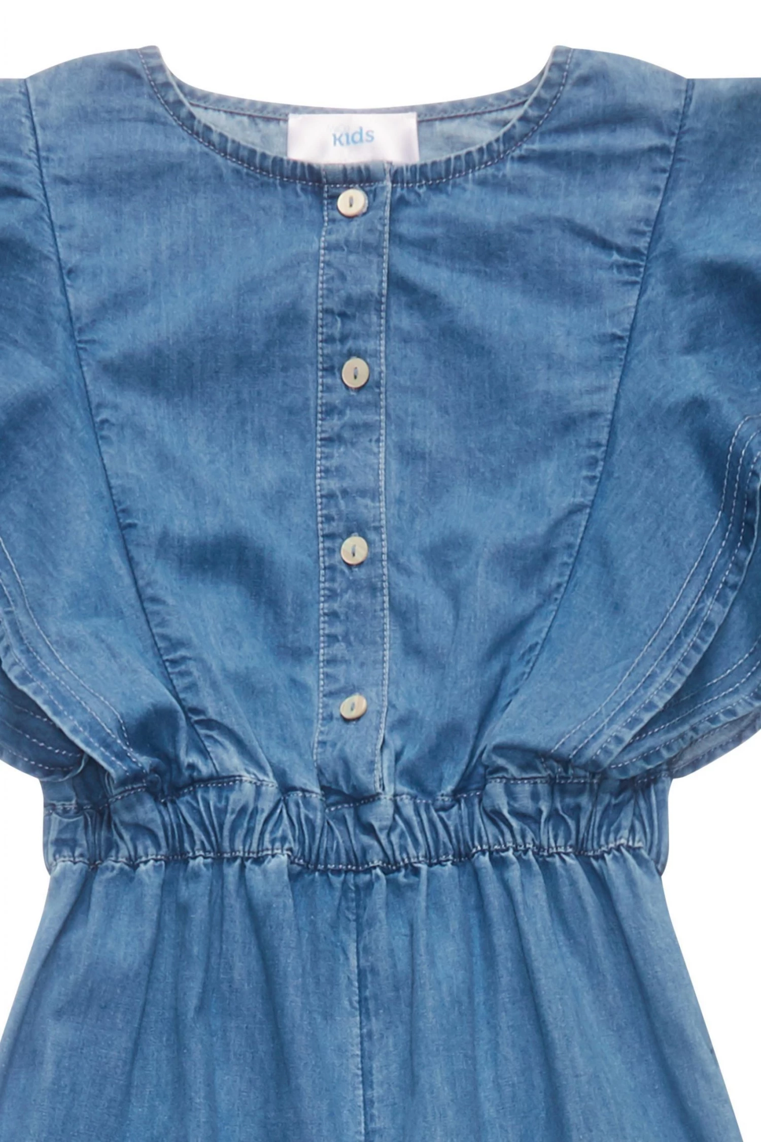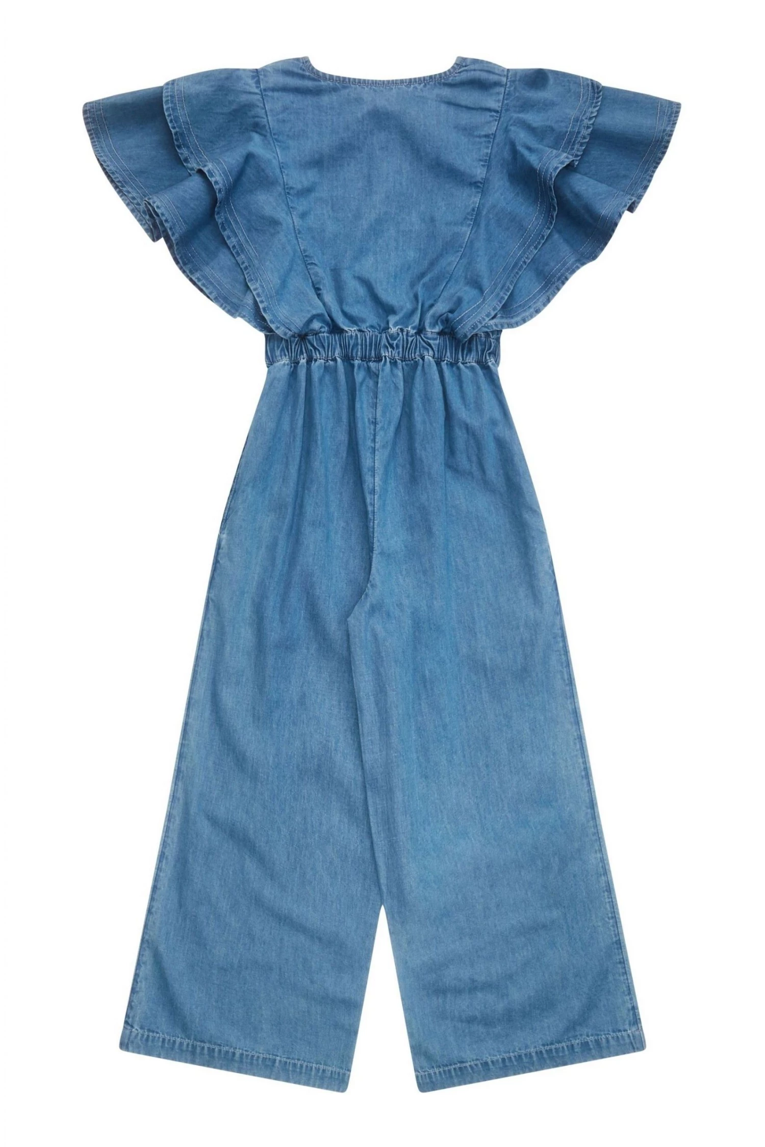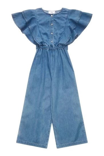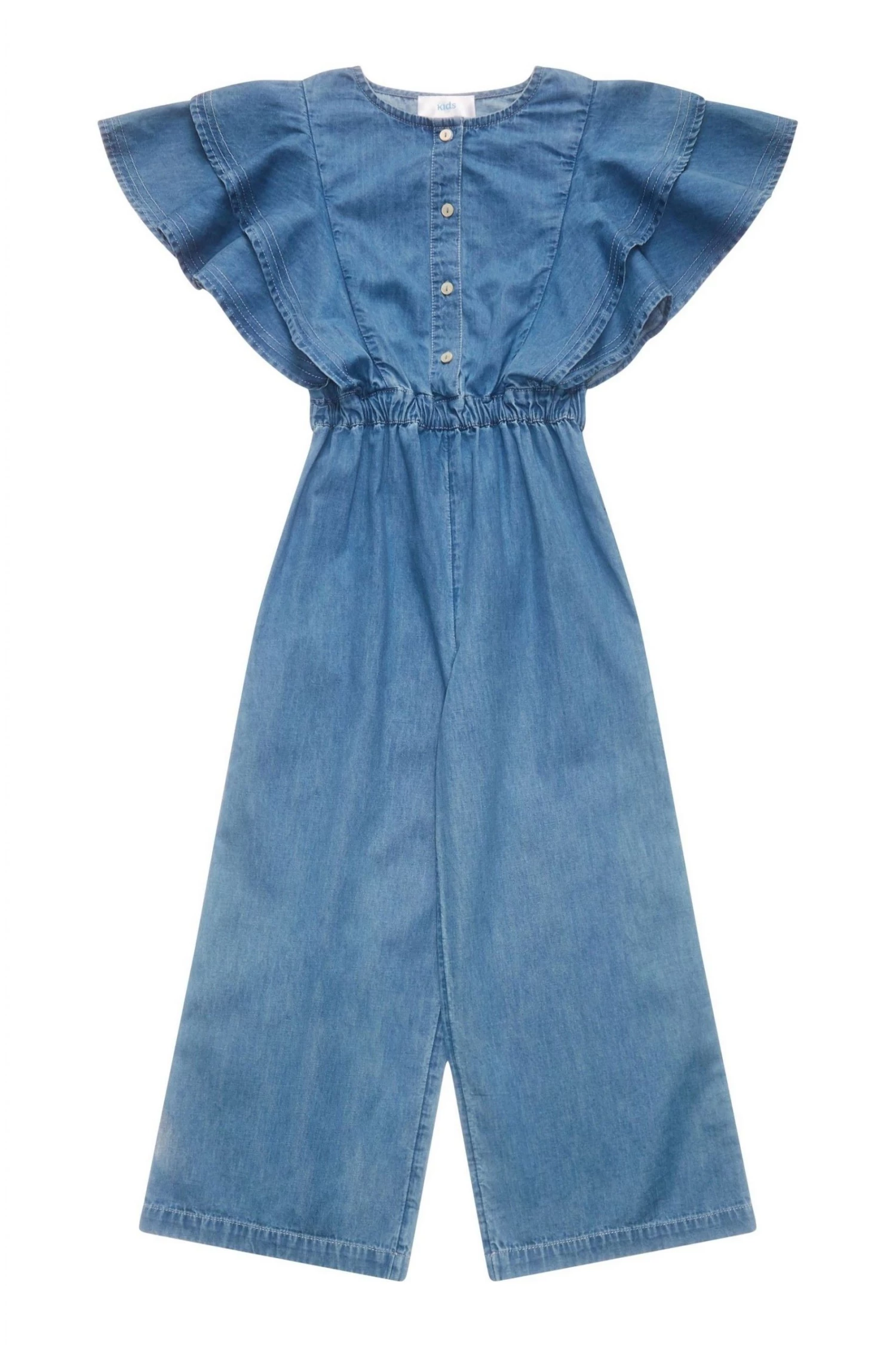 This denim jumpsuit feature short frill sleeves, a button down front, wide legs and an elasticated waist. Pair with sandals for the perfect holiday look.