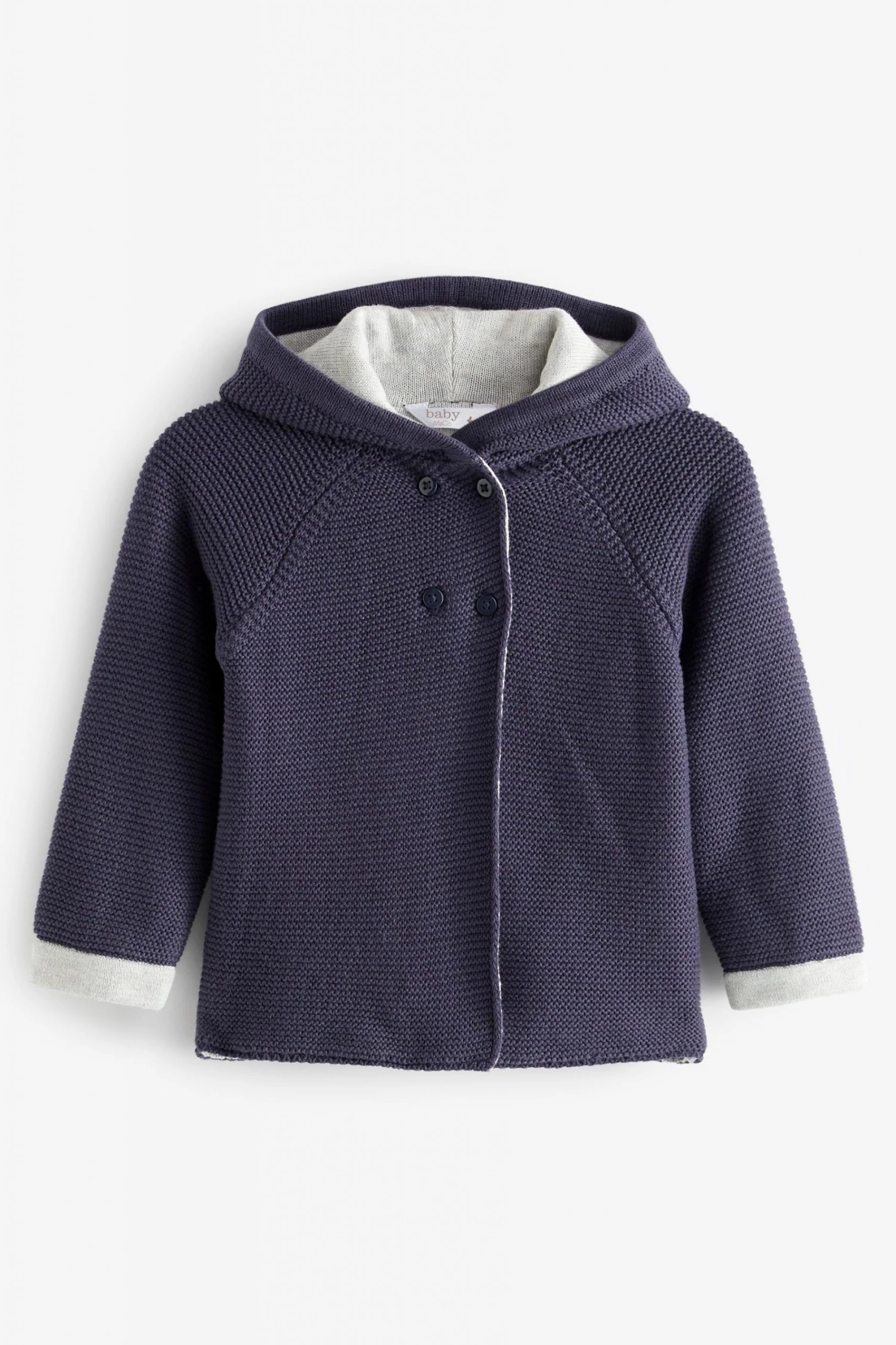 This precious navy knitted coatigan will keep baby warm all winter long! Featuring long sleeves, a double button front closure and a hood with pom pom detailing.