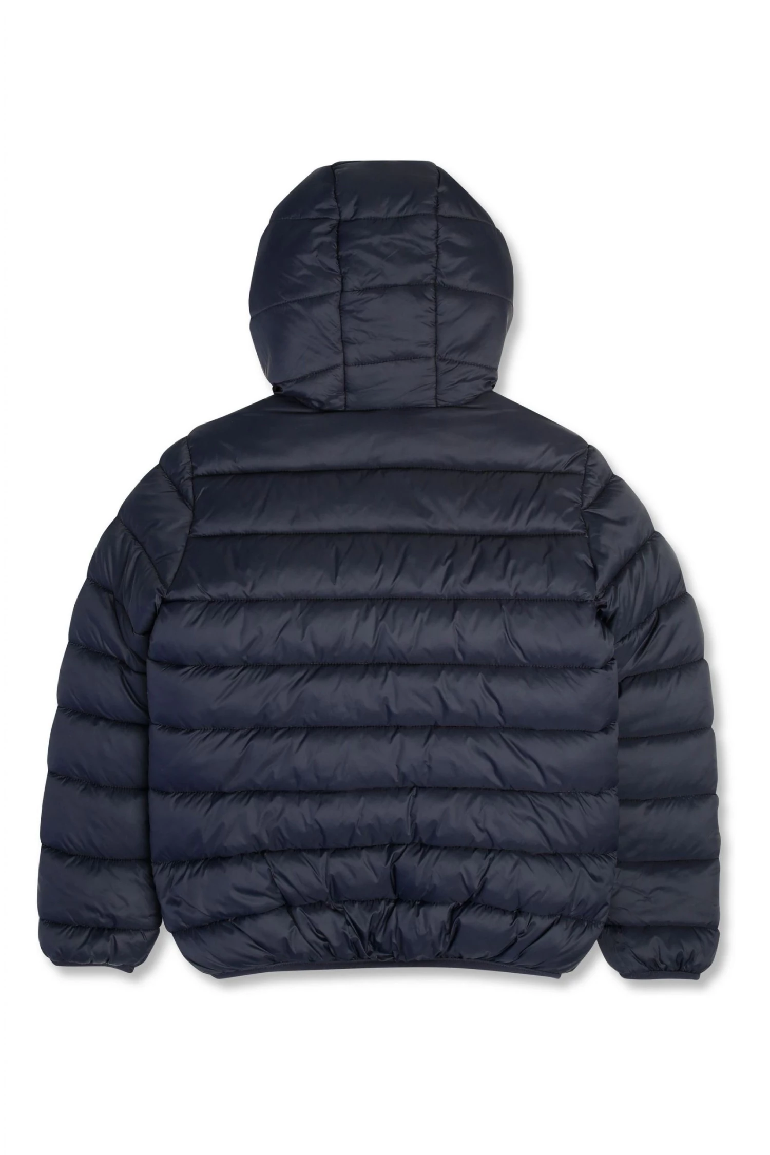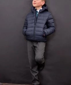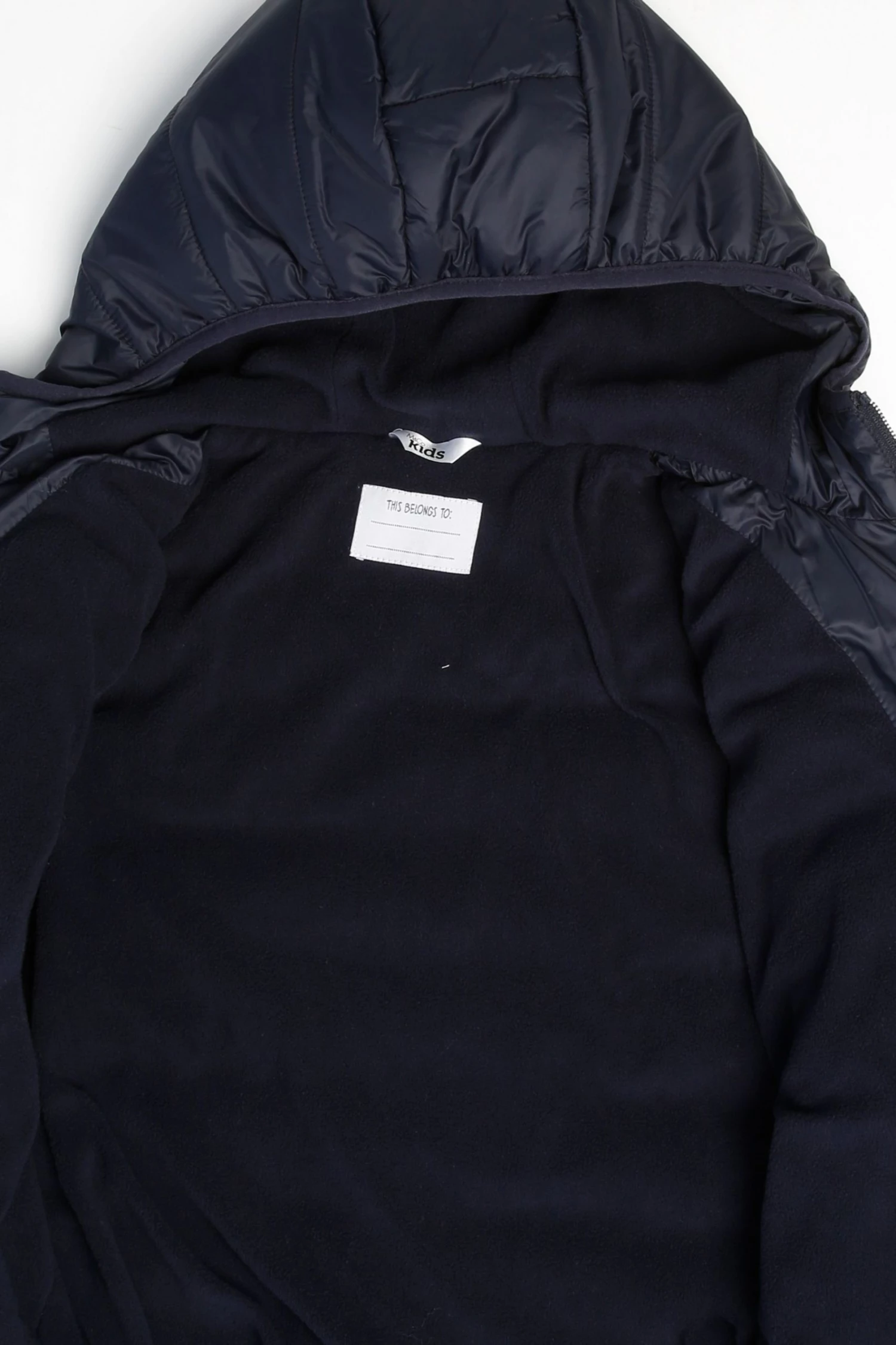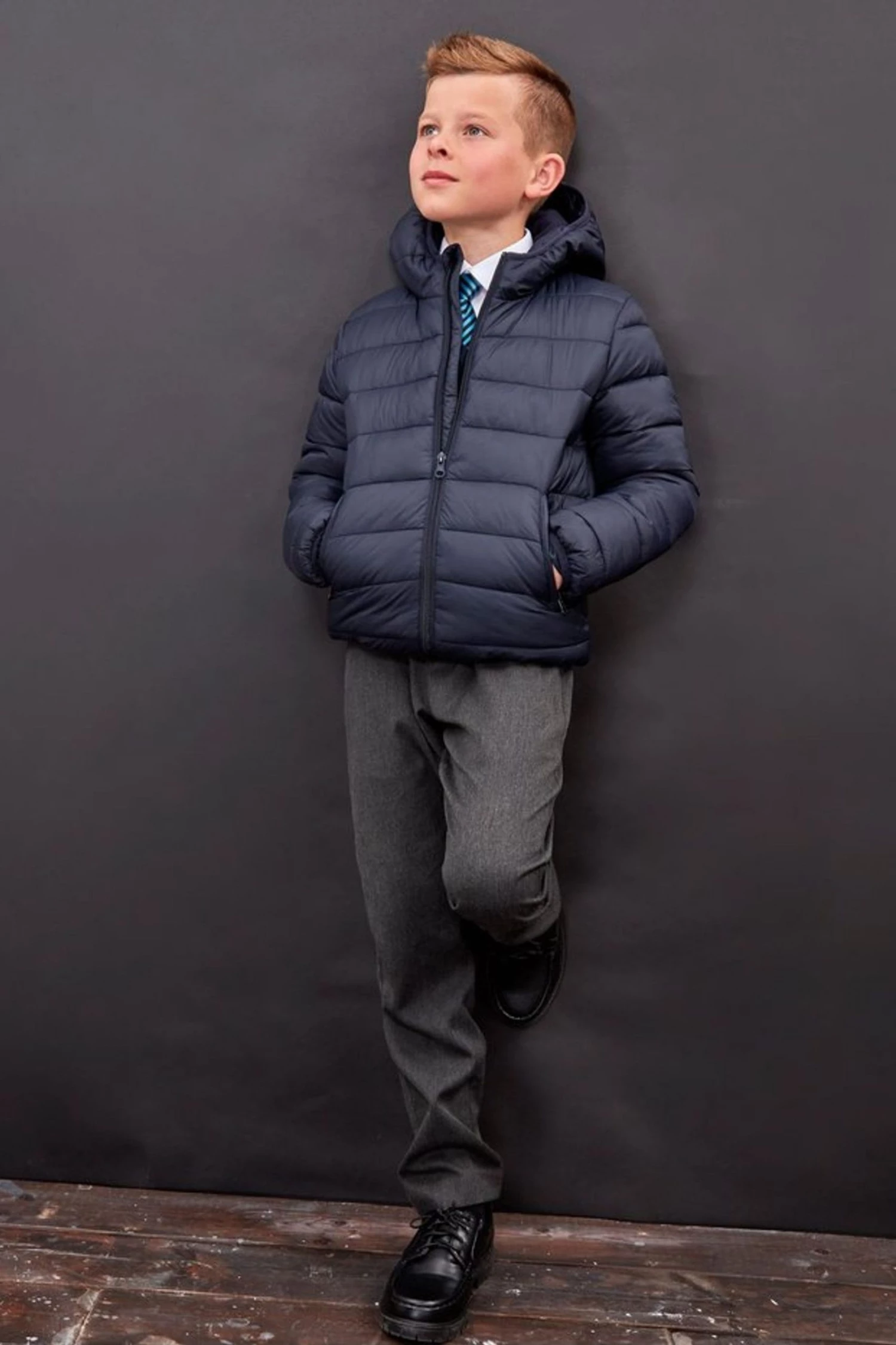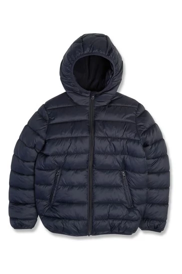 This boys puffer jacket is designed in a versatile navy shade and features long sleeves, a front zip, hood and zip up pockets.