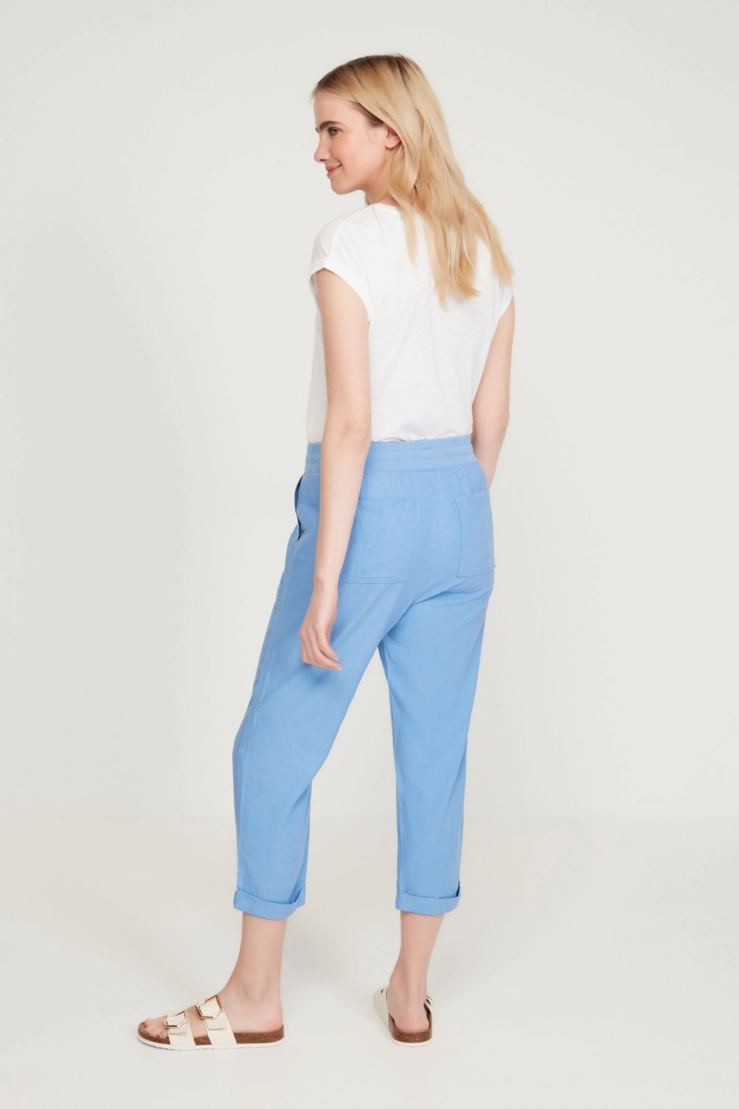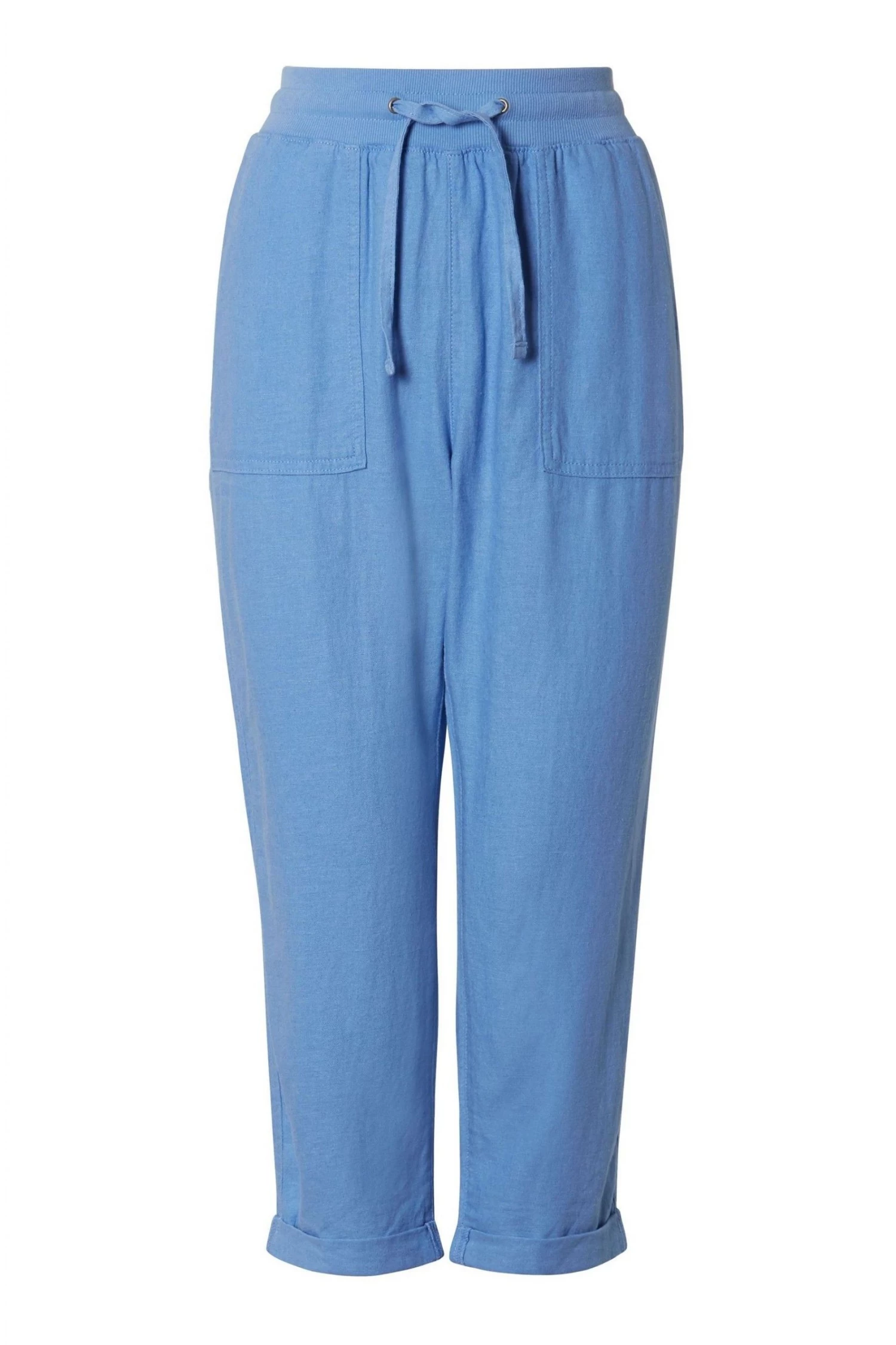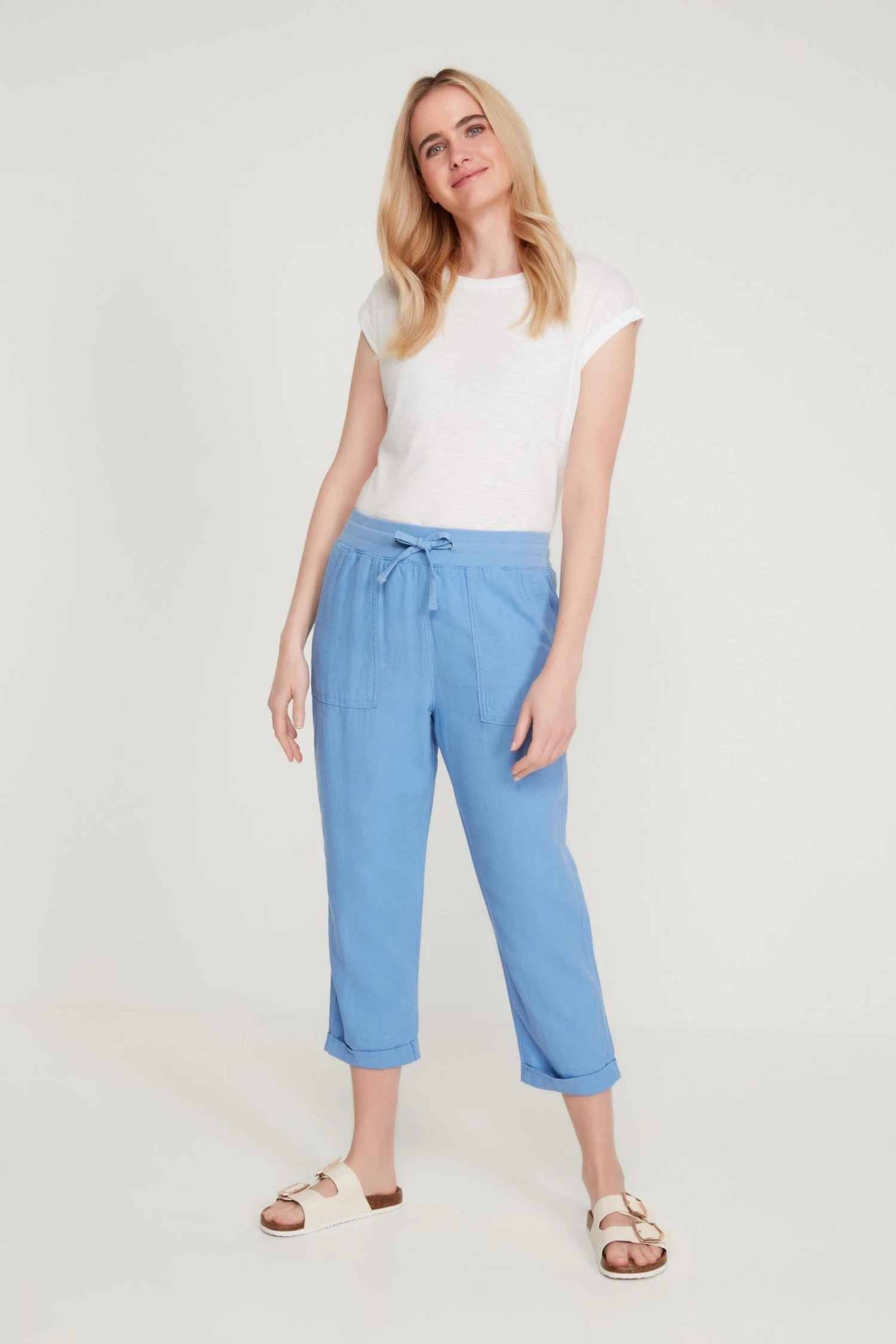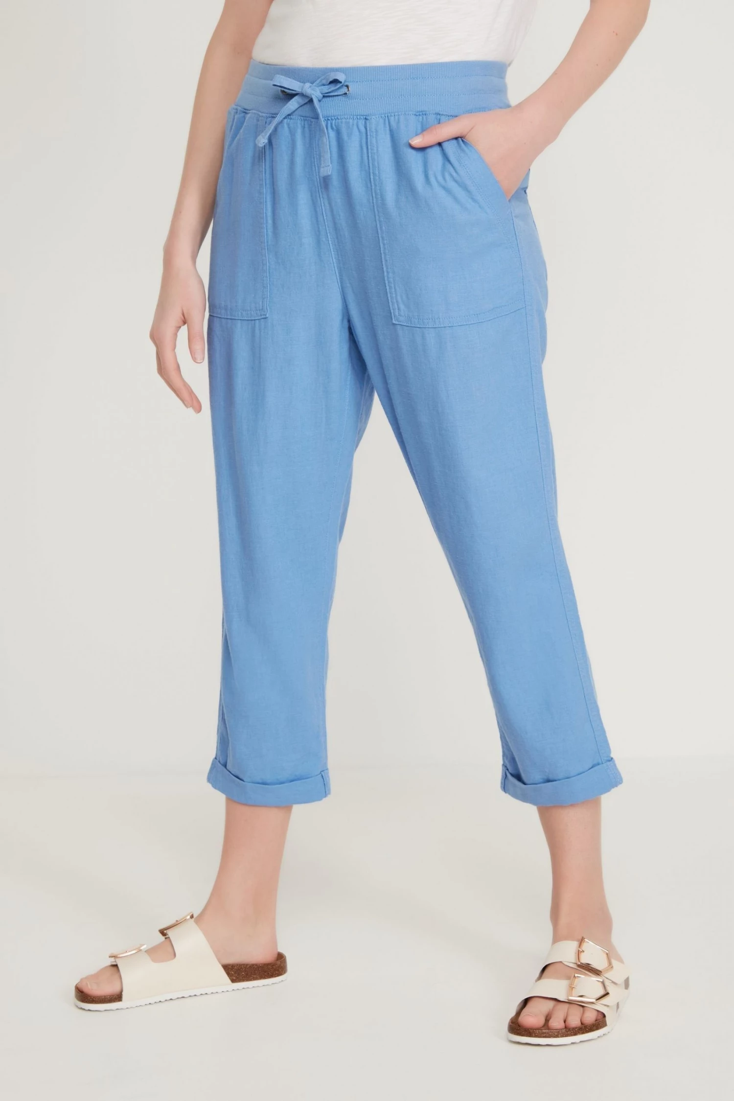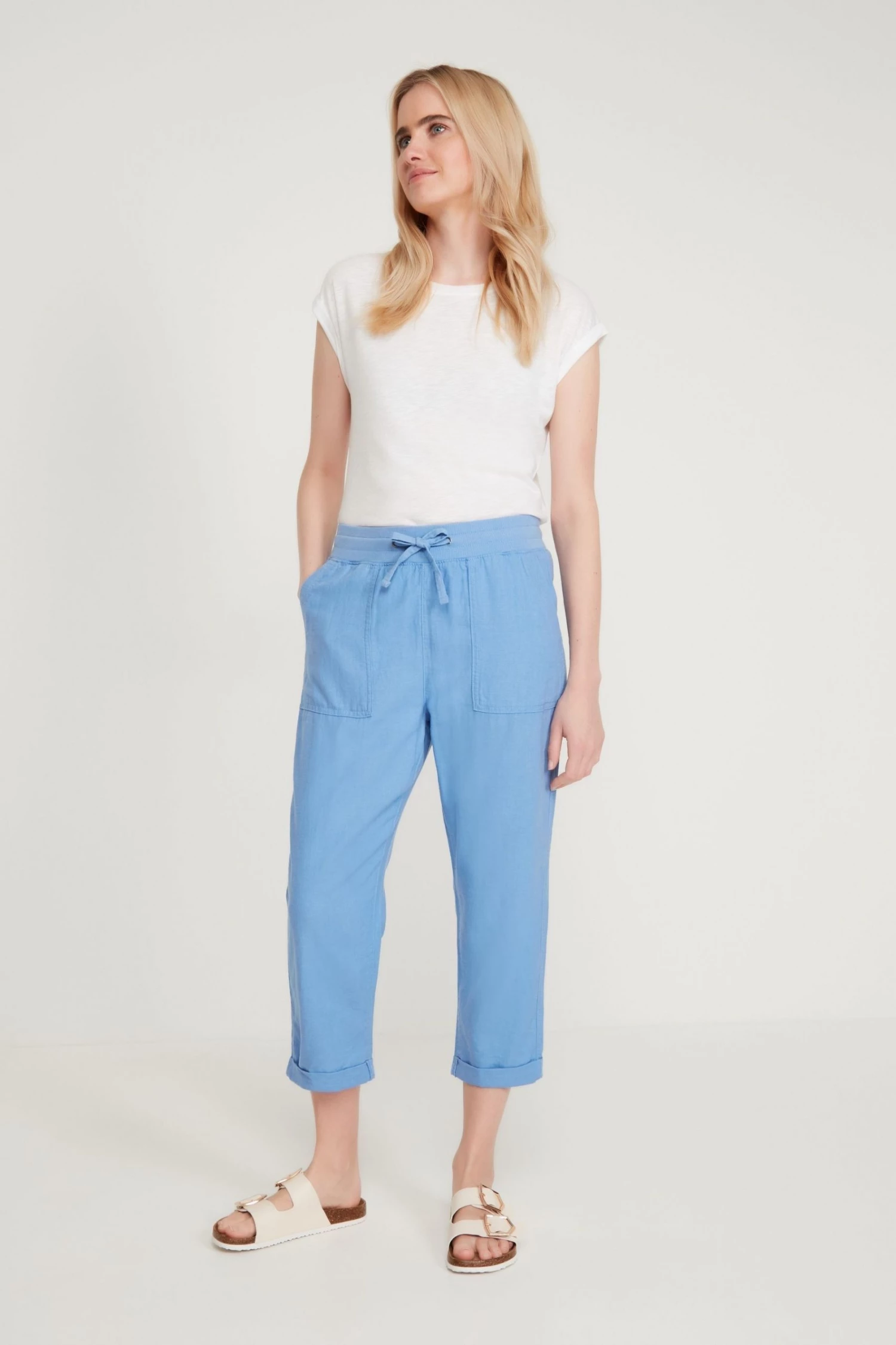 Update your wardrobe for the new season with these cropped trousers, featuring an elasticated waist with drawstring, cool linen fabric and a turn up hems. Pair with a t-shirt and sandals for an easy summer look.