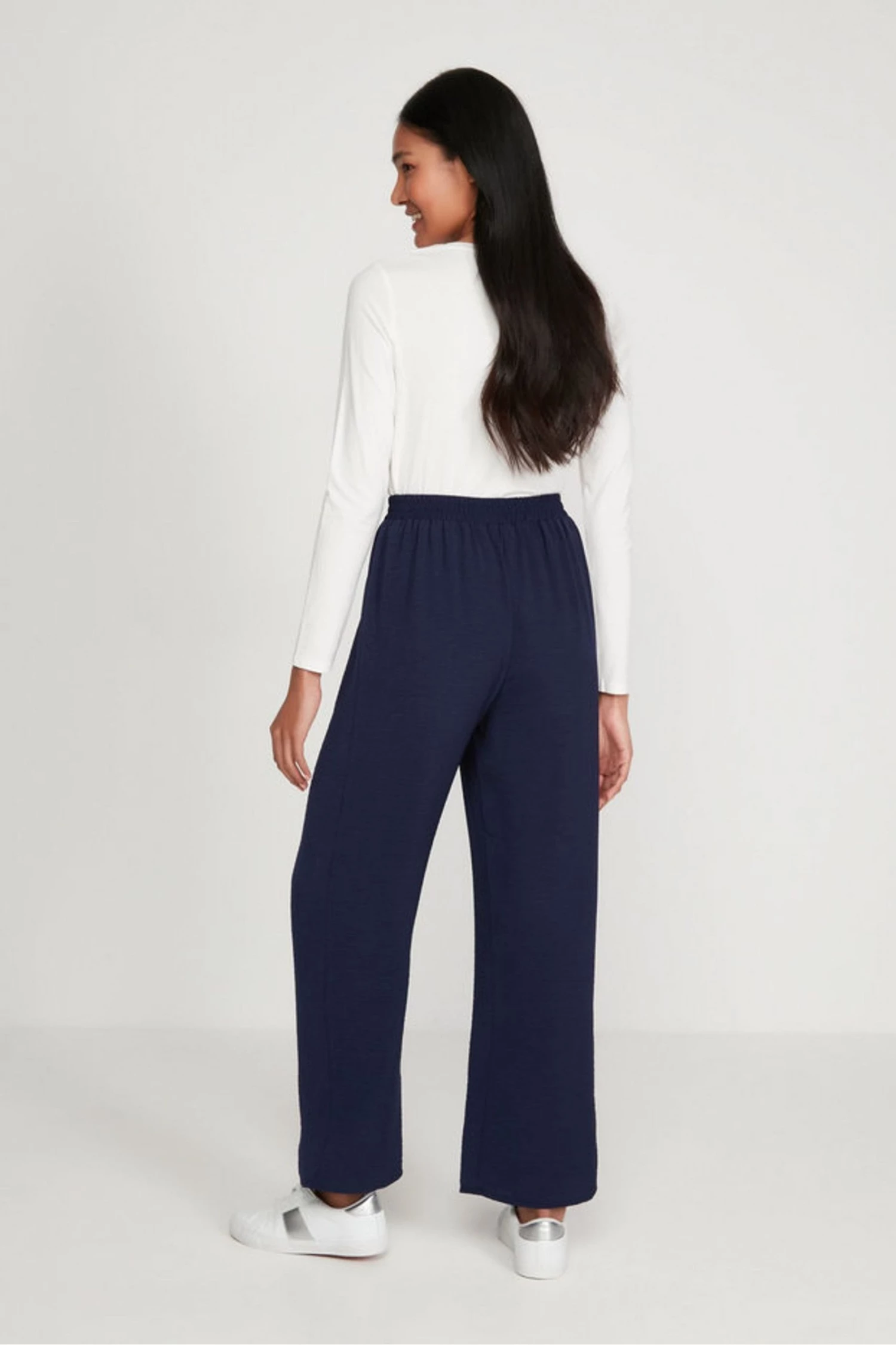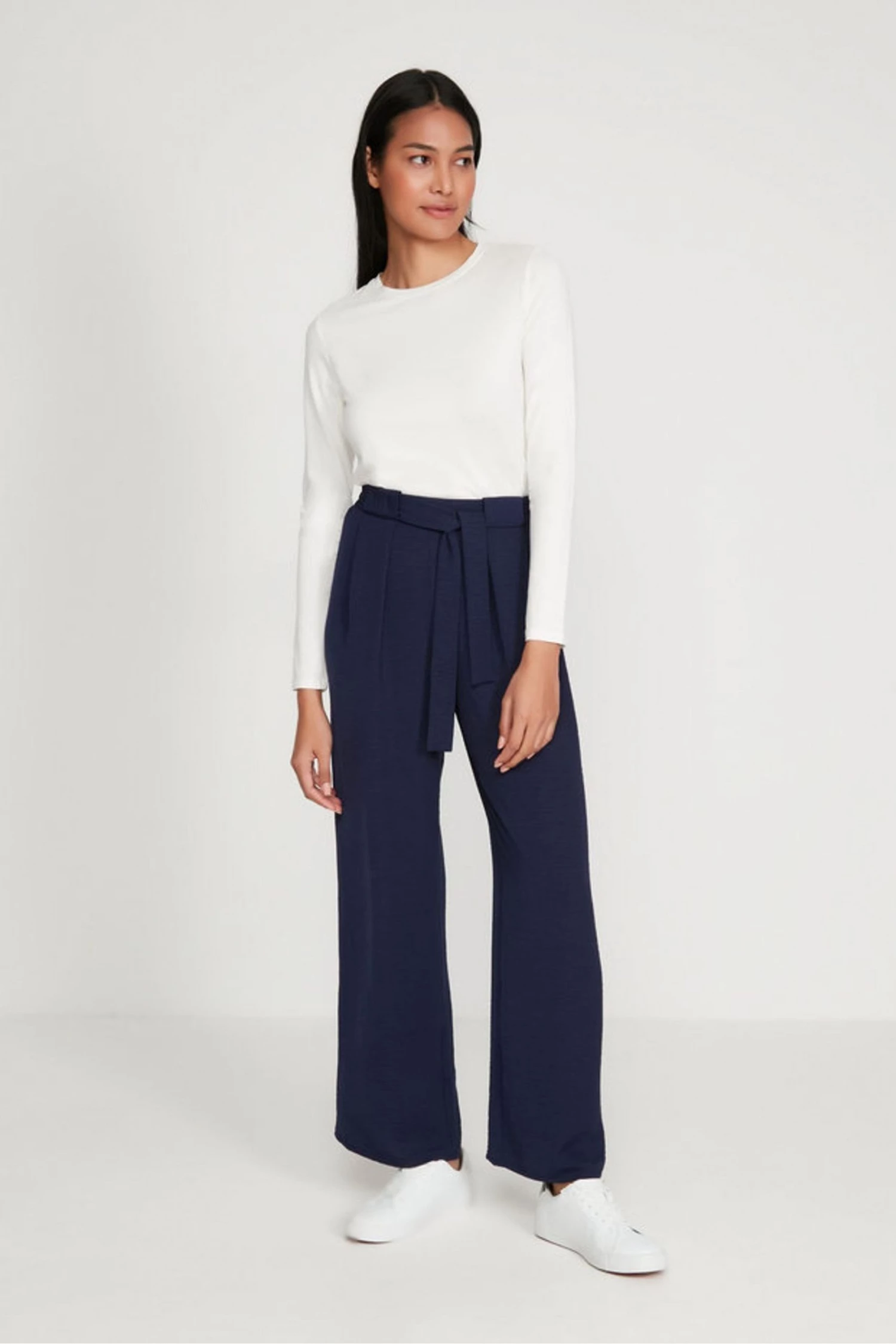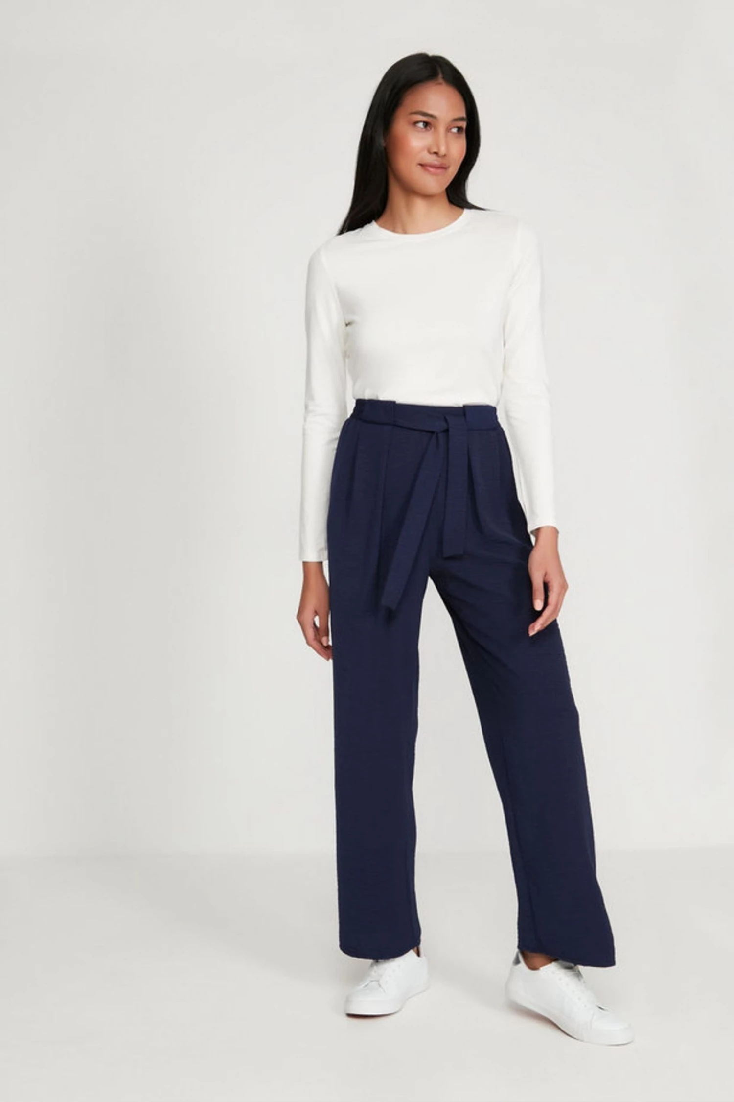 Update your wardrobe this season with these navy wide leg trousers. With a tie waist and turn up design, these are an essential. Pair with a T-shirt and trainers or sandals for an easy day time look.