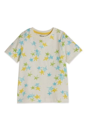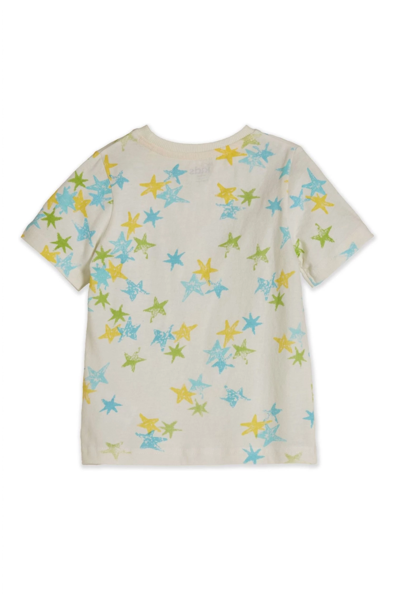 This cream short sleeve boys’ T-shirt features a fun all over star print, easy to style with joggers and trainers.