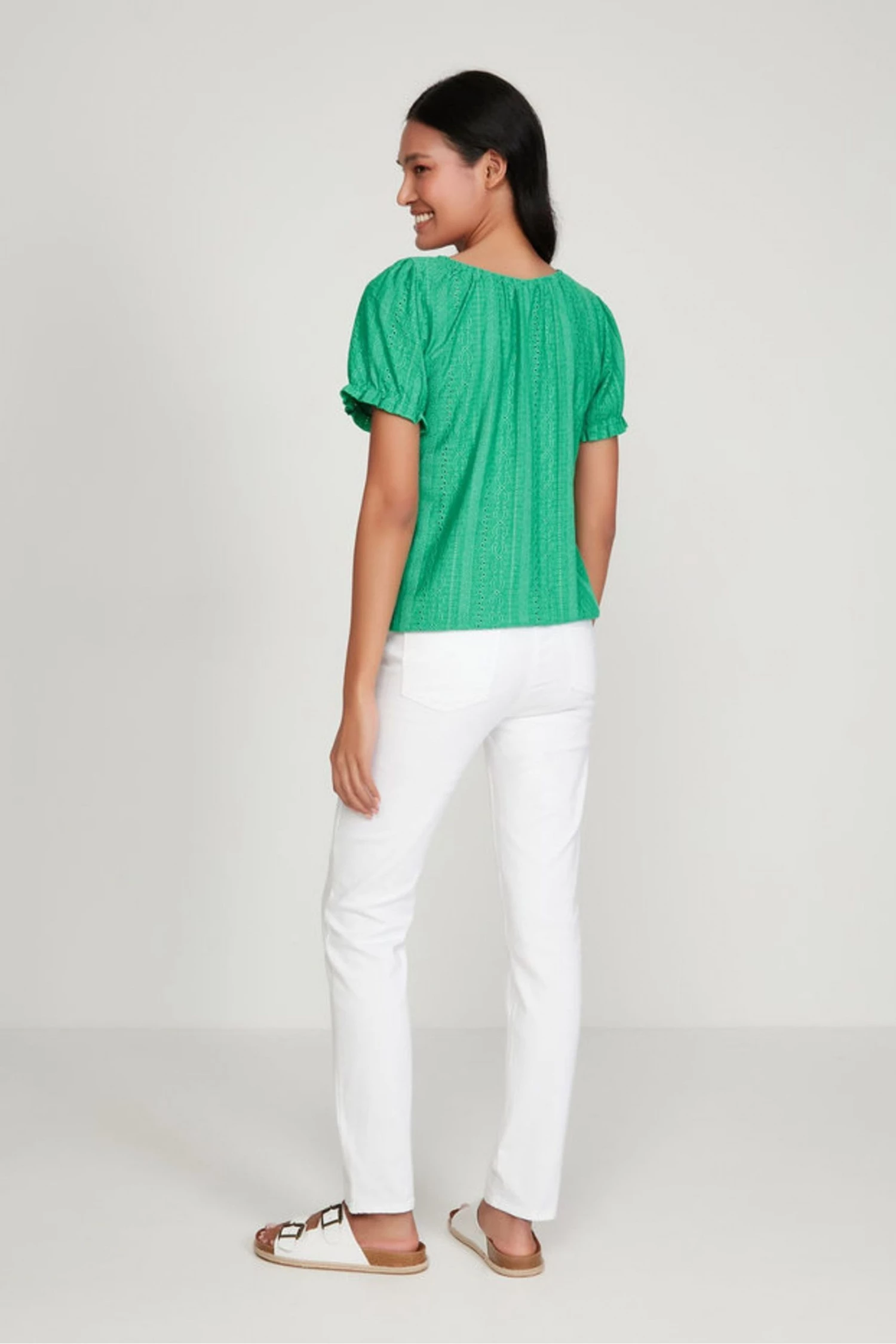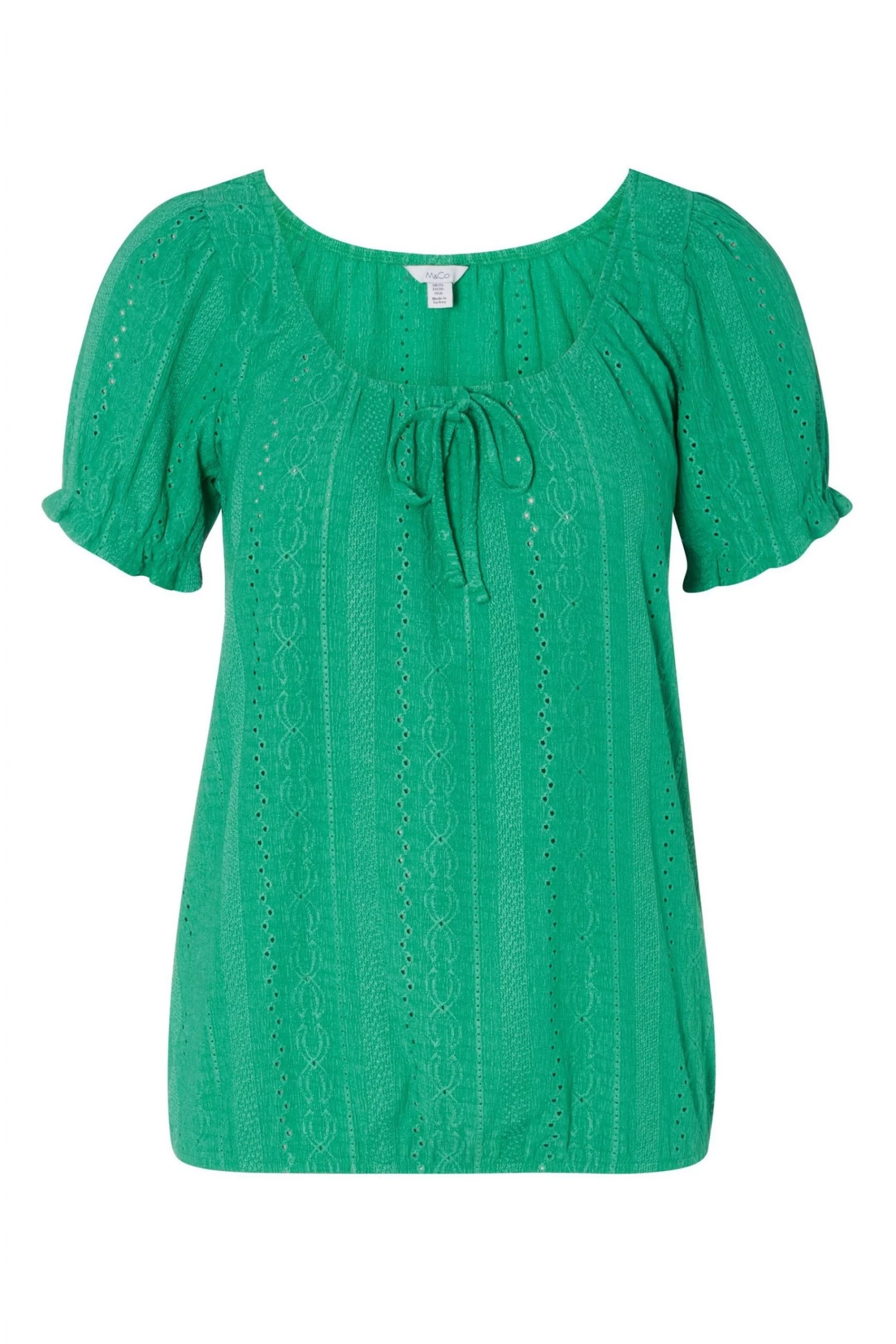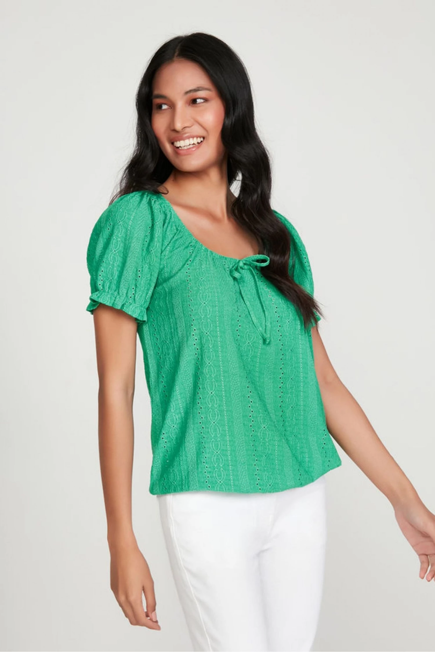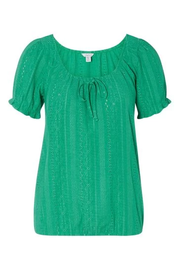 Designed with all-over broderie detailing, this puff sleeved top is a new season staple. With a tie detail and bubble style hem, this can be worn with jeans and trainers or sandals for a day time chic look.