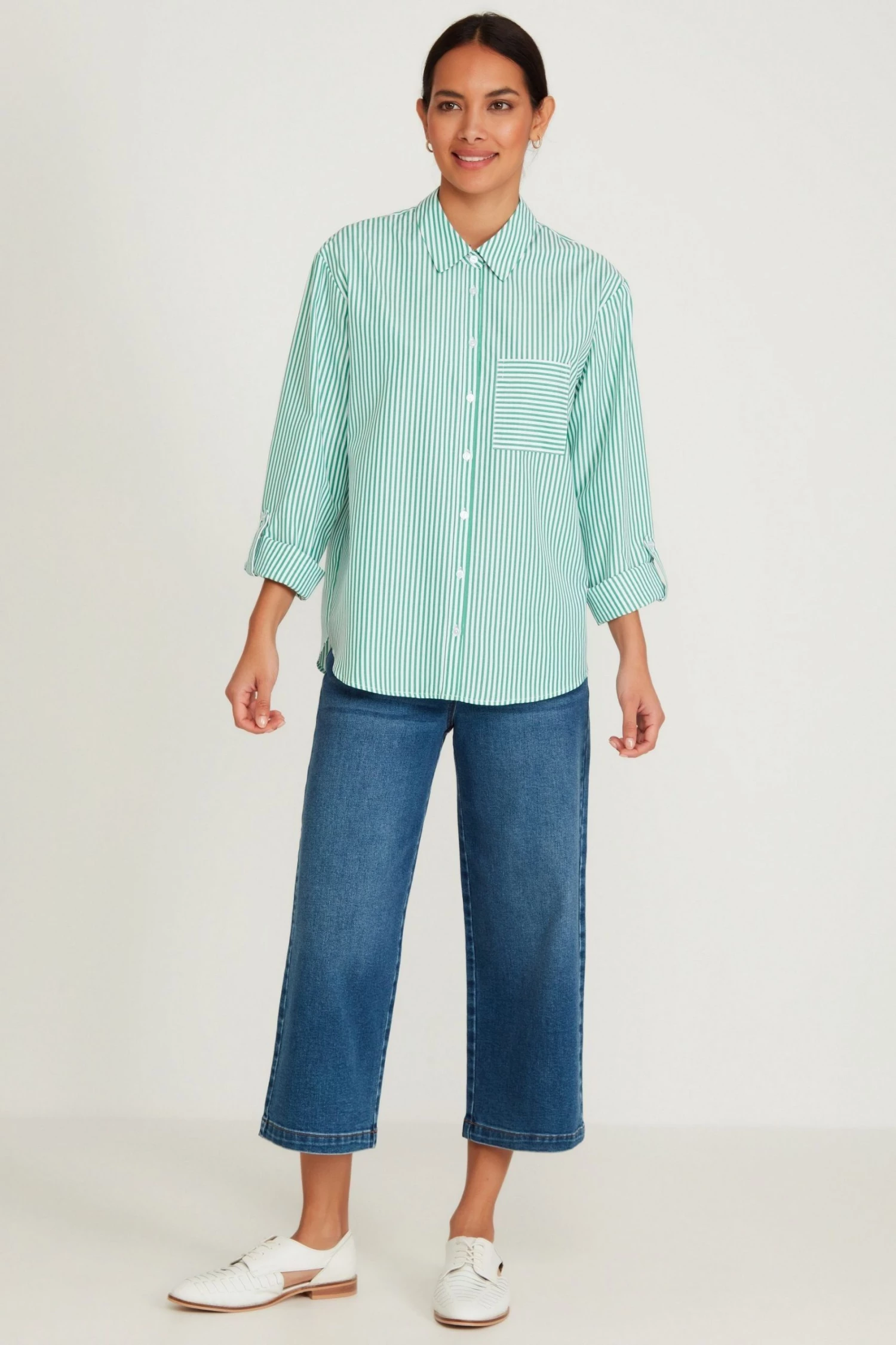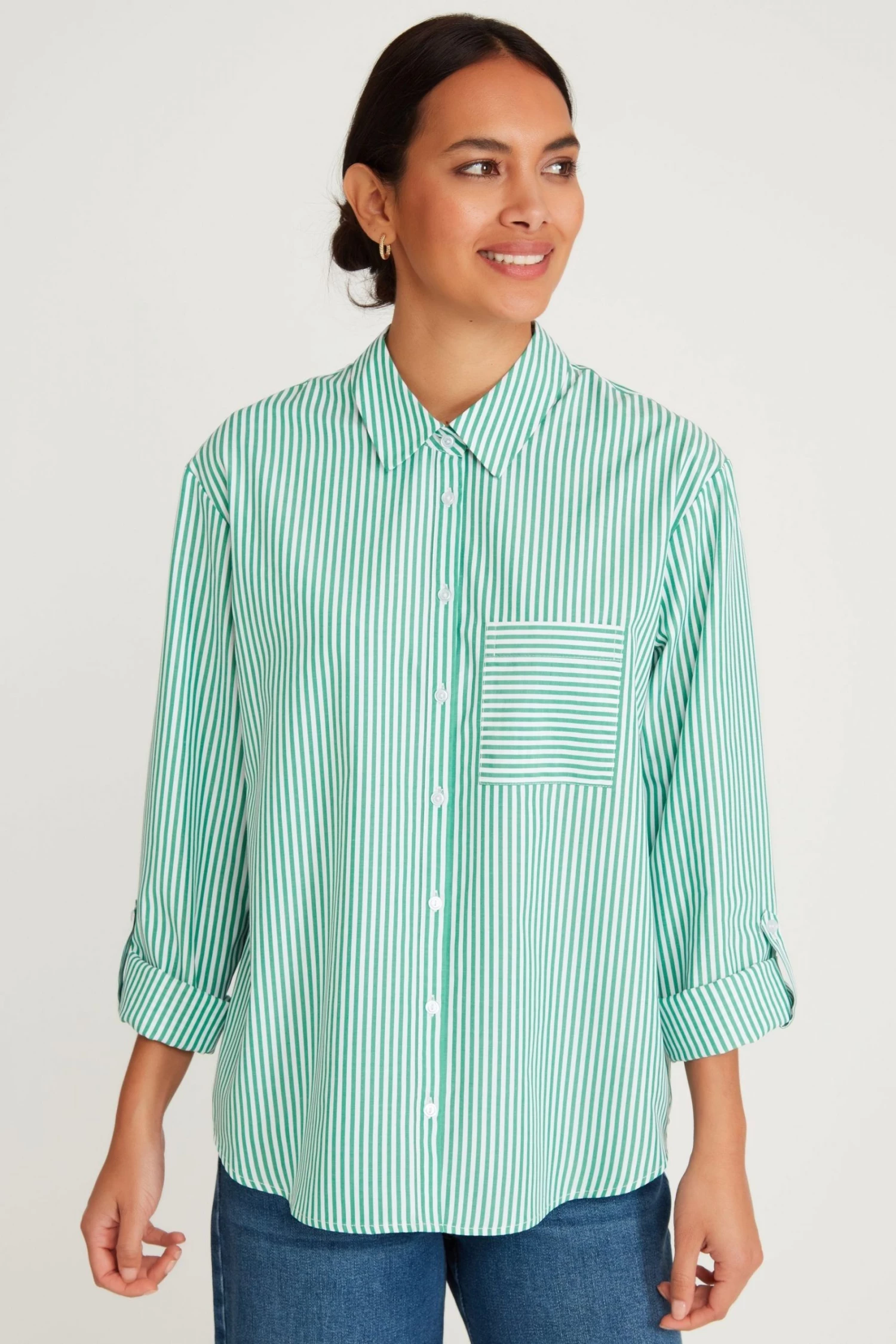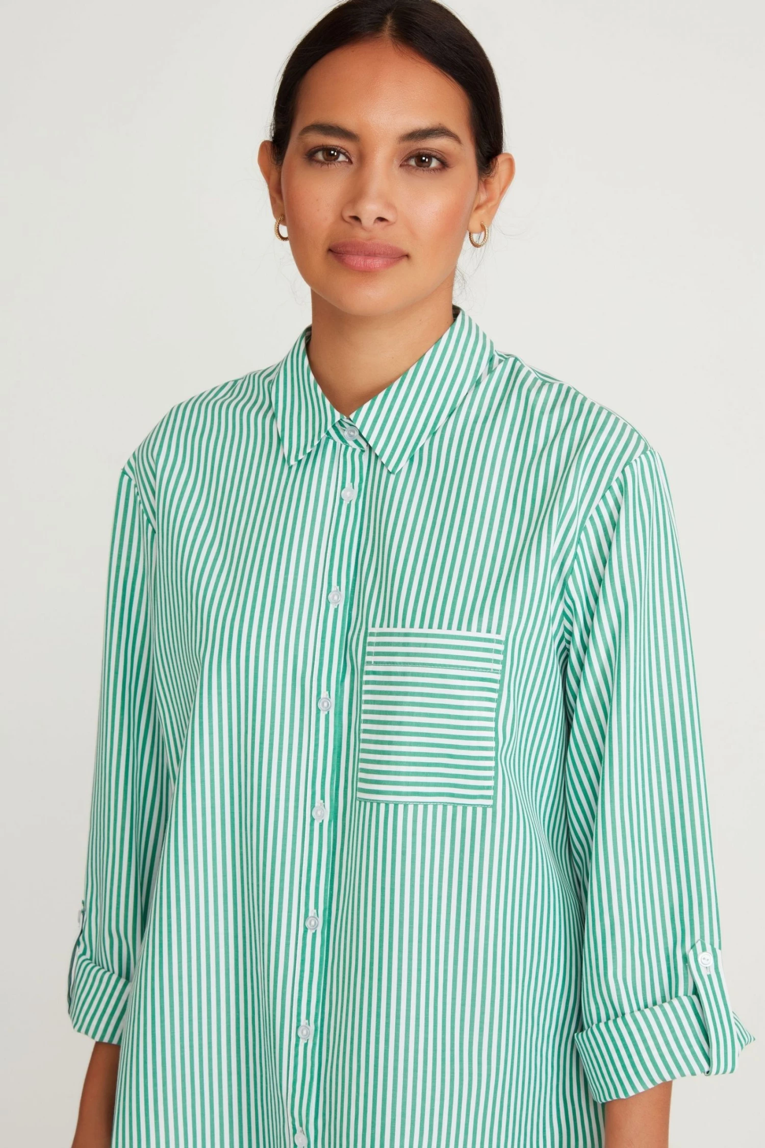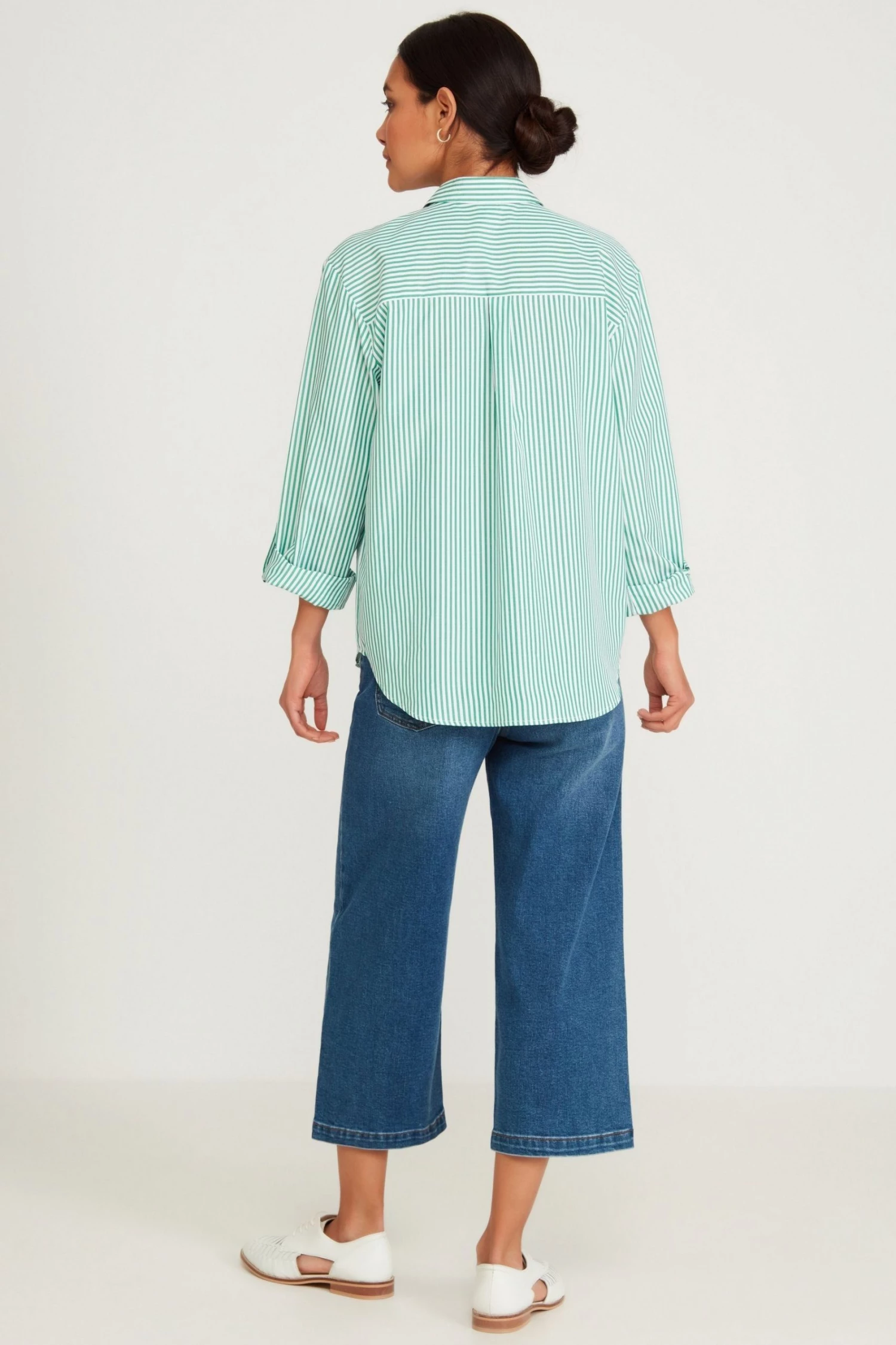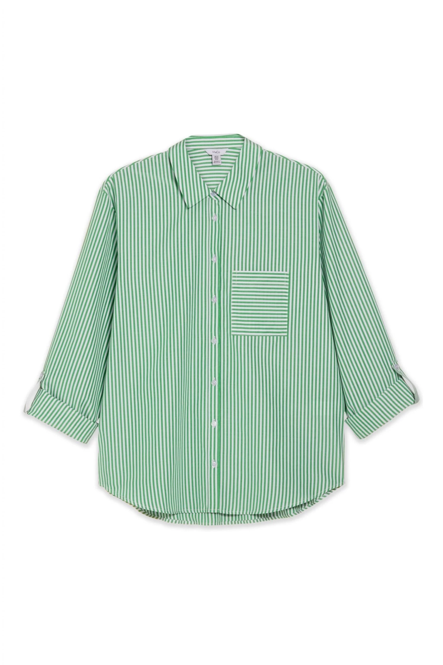 Smarten up your wardrobe this season with this green poplin stripe shirt. Featuring a comfortable fit with a collared neckline and button-through fastening. Style with jeans and a black boot for a trendy twist on a classic look.