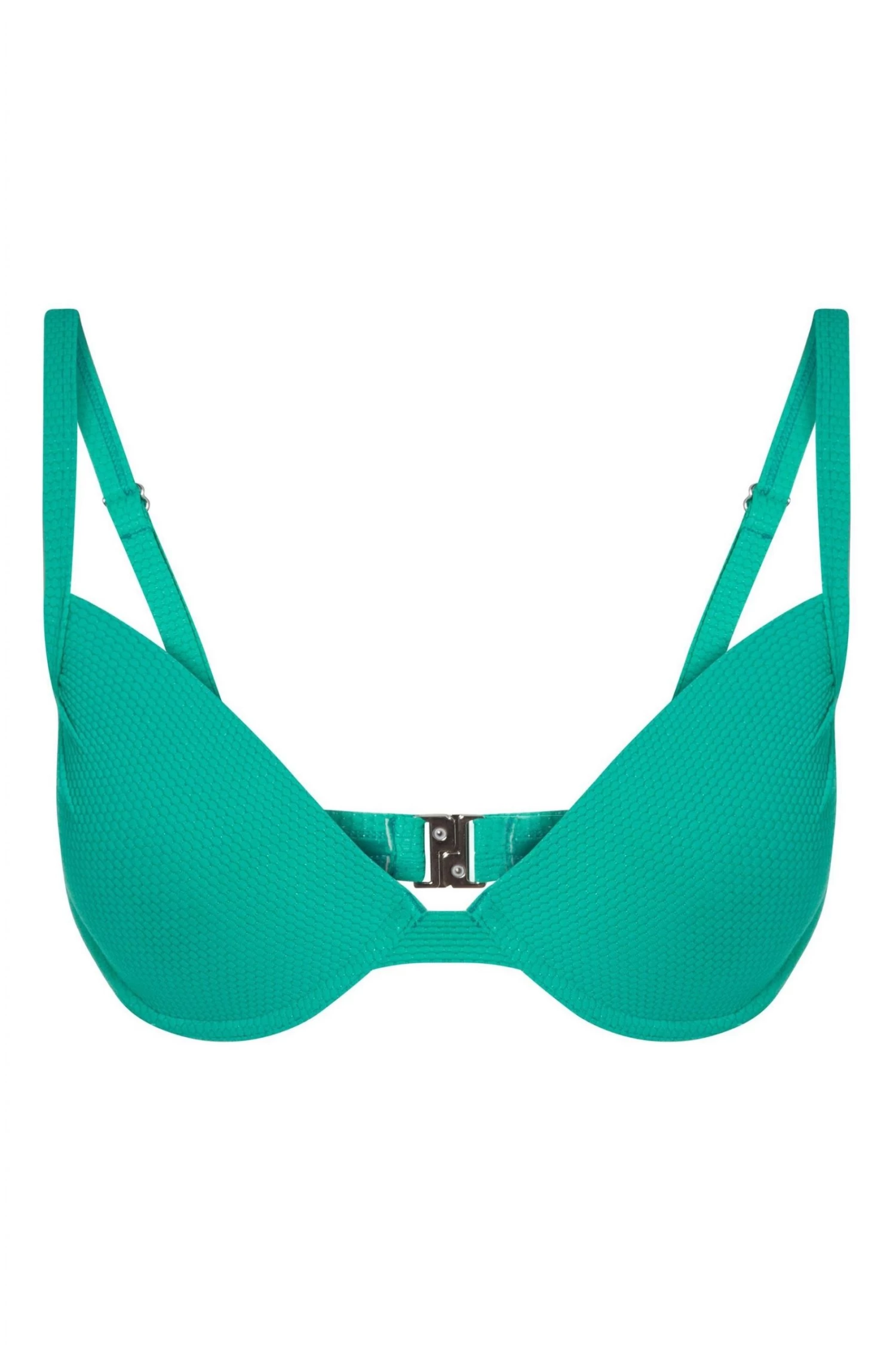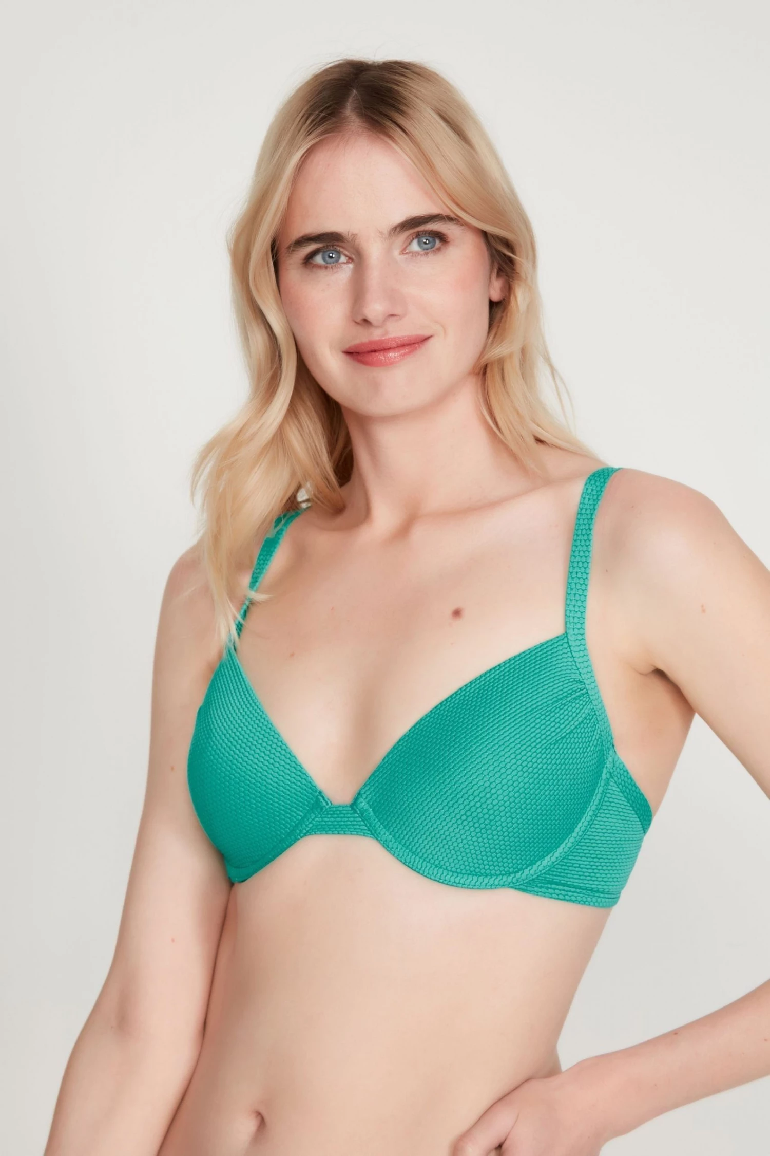 This bikini top features underwire, supportive straps and a full cup coverage. The crinkle material comes in a beautiful shade of green. Pair with any matching bottoms.