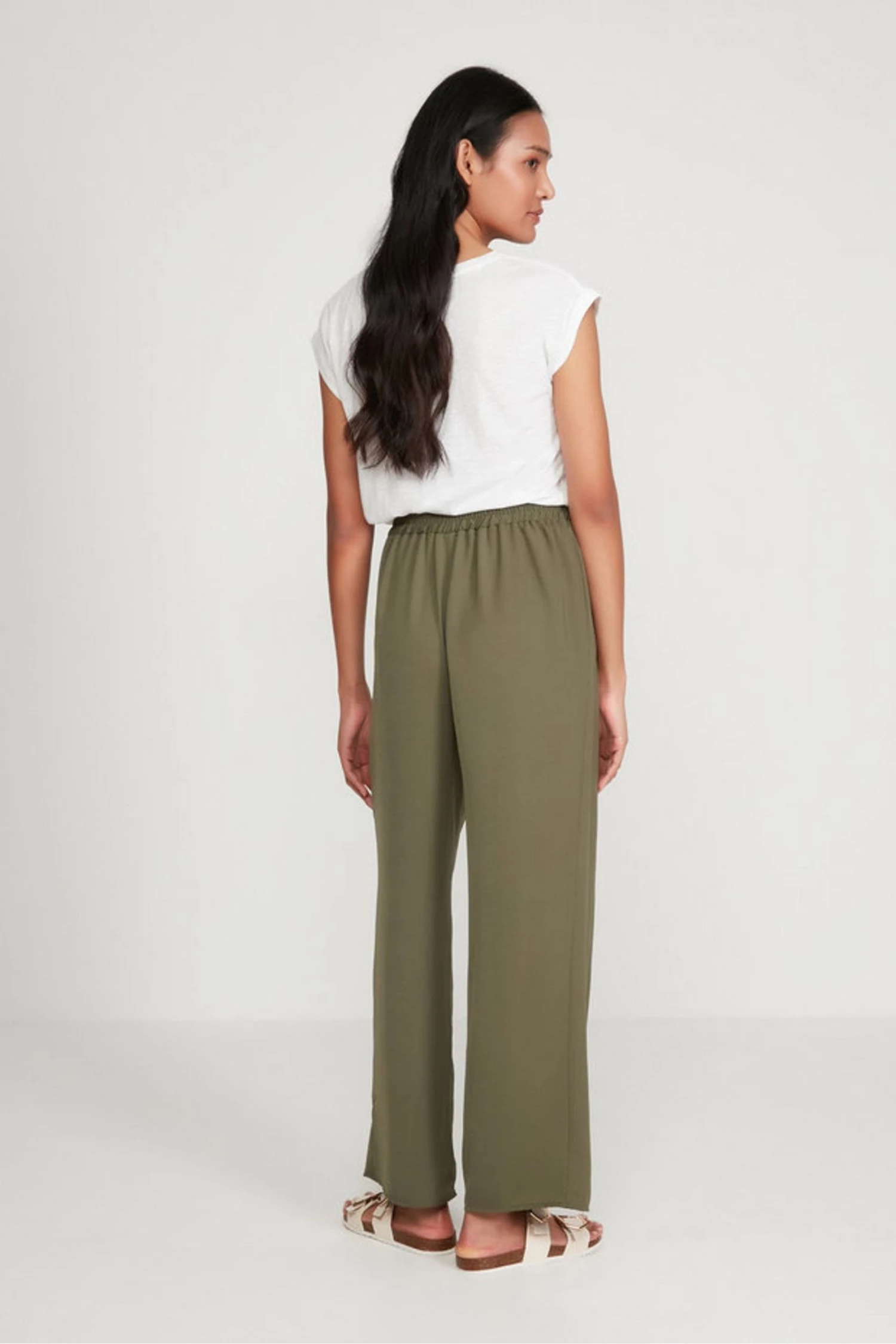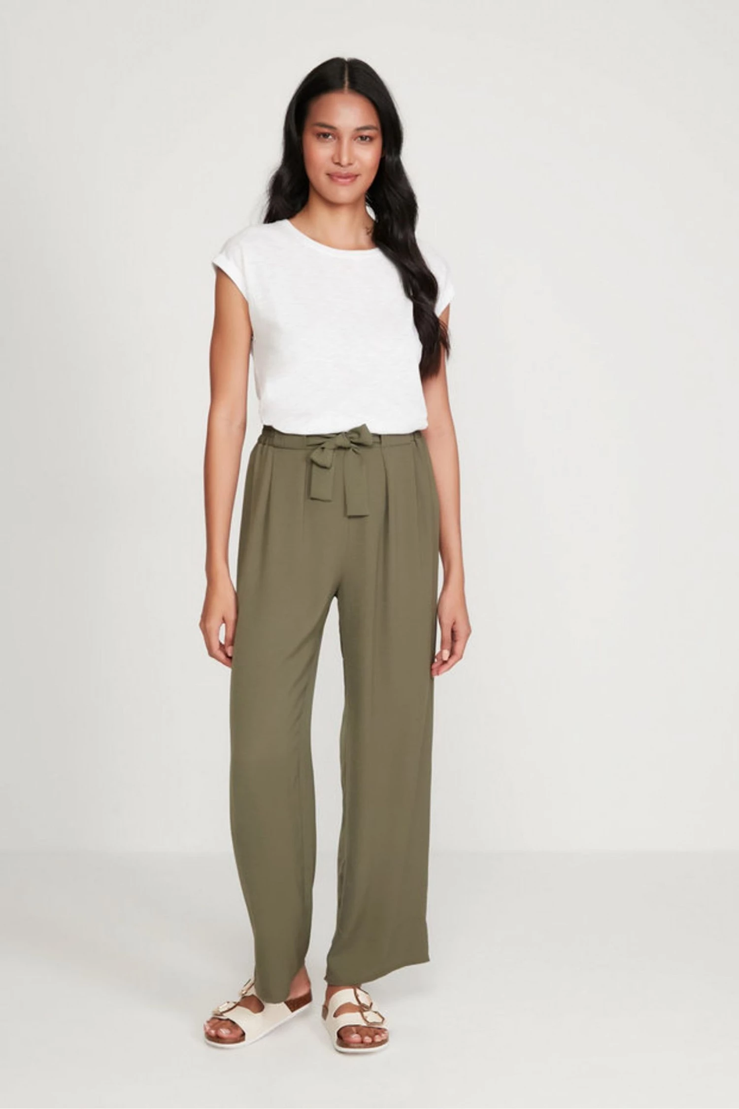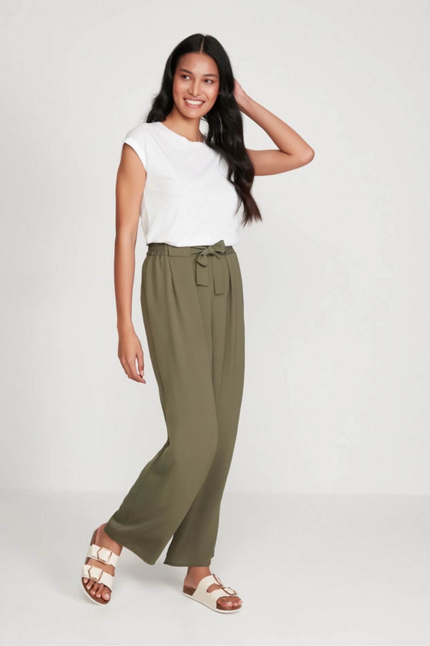 Update your wardrobe this season with these khaki wide leg trousers. With a tie waist and turn up design, these are an essential. Pair with a T-shirt and trainers or sandals for an easy day time look.