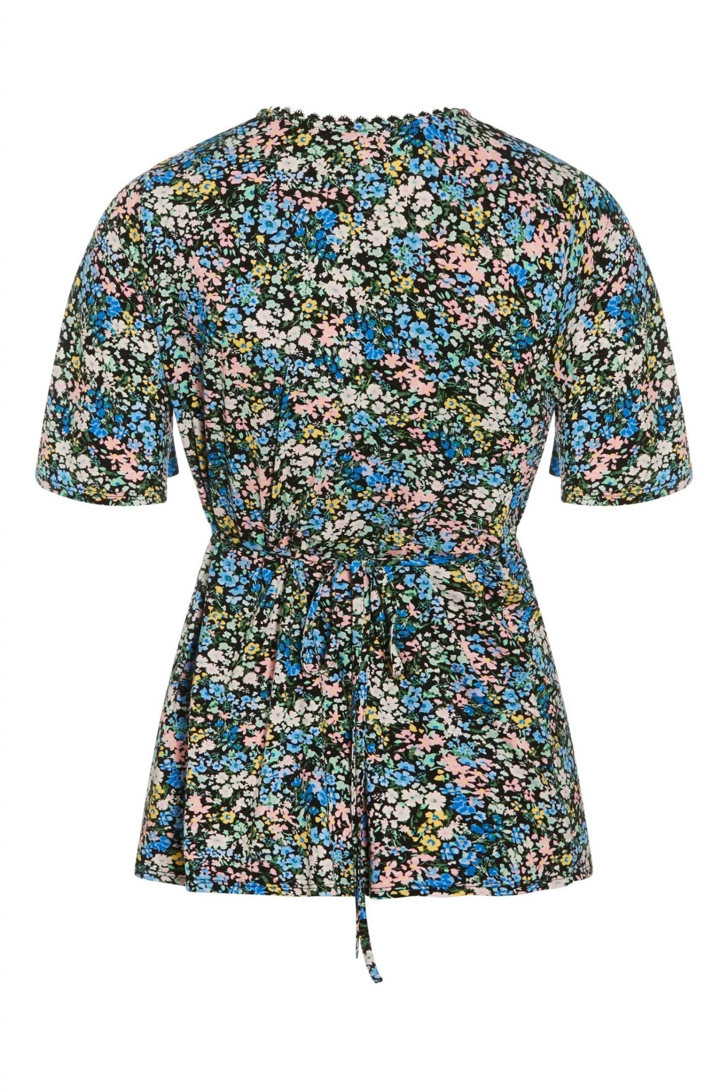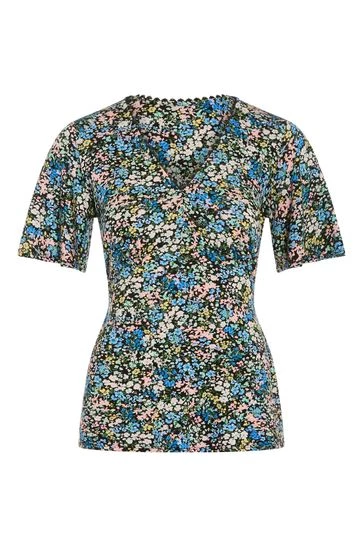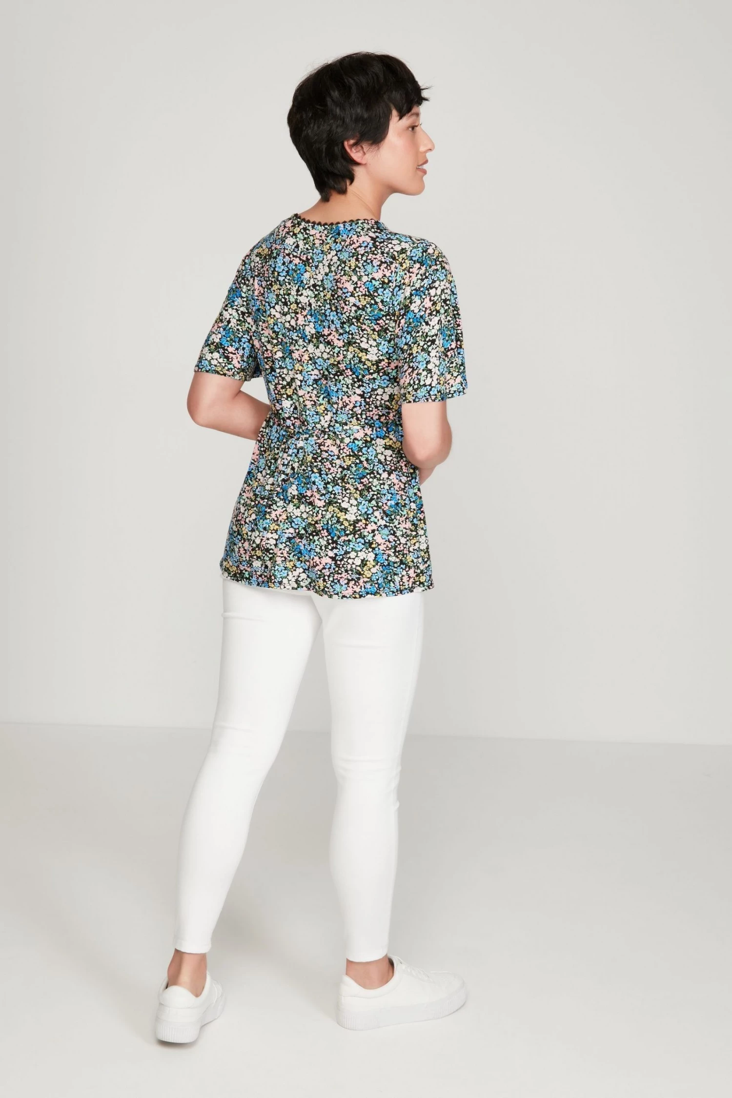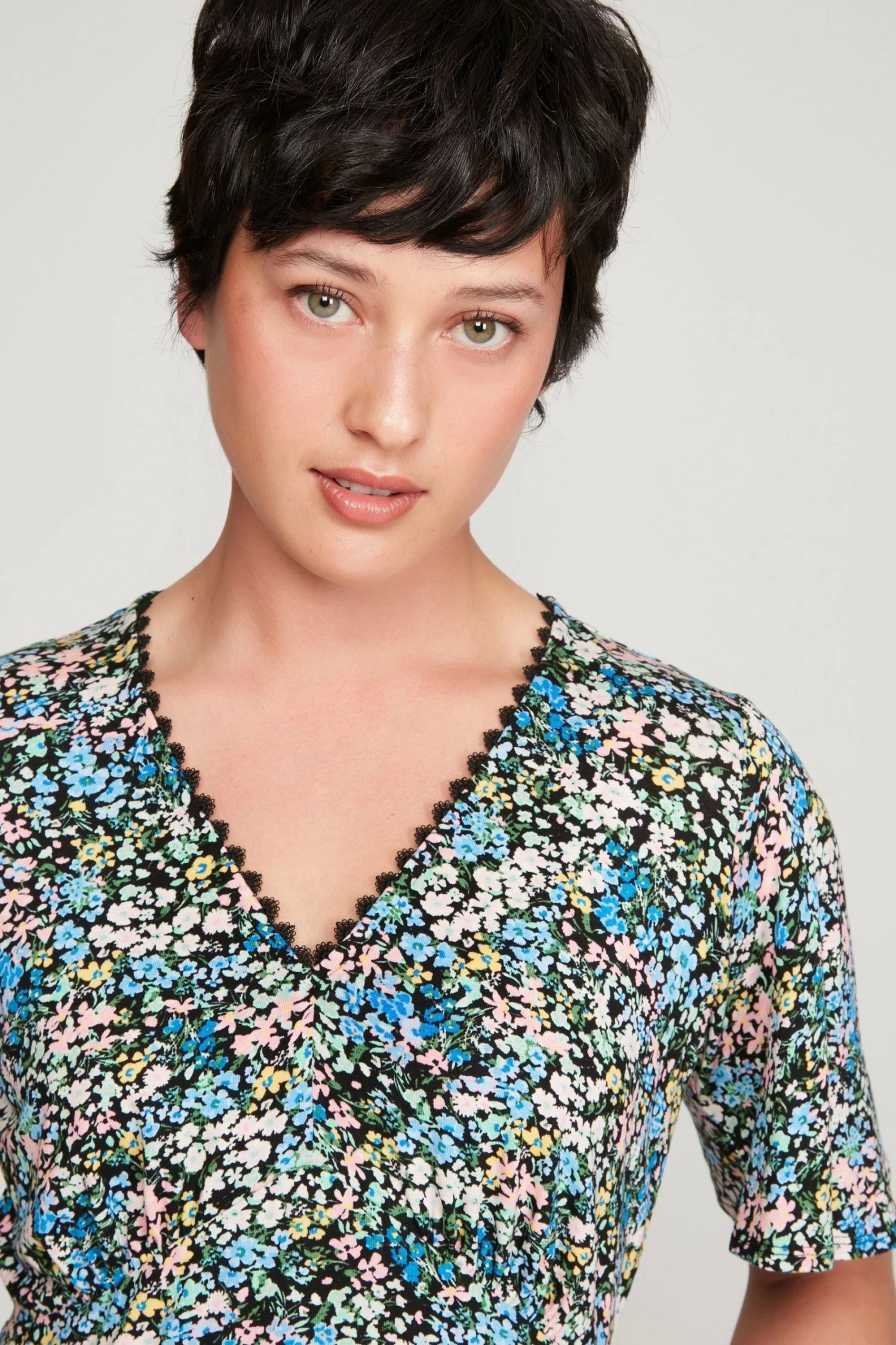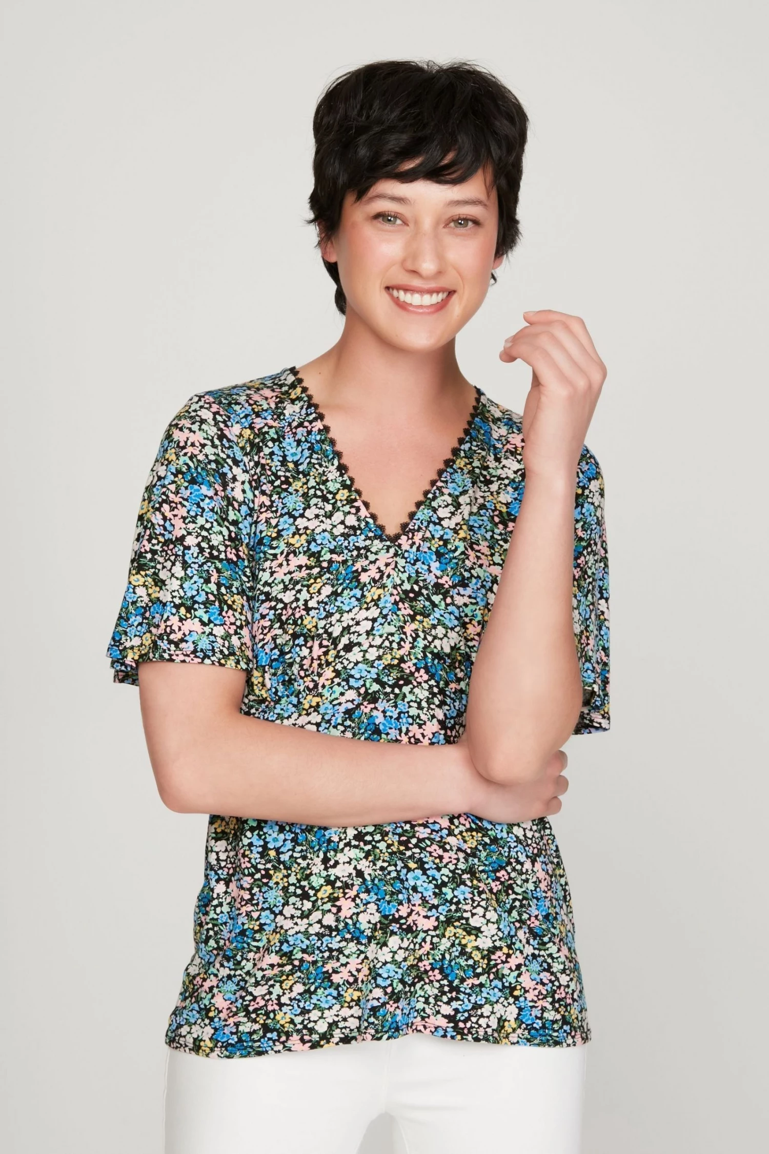 Coming in a pretty floral print, this petite top features short sleeves, a V-neckline and lace trim detailing. Pair with jeans and boots for a stylish day to night look!