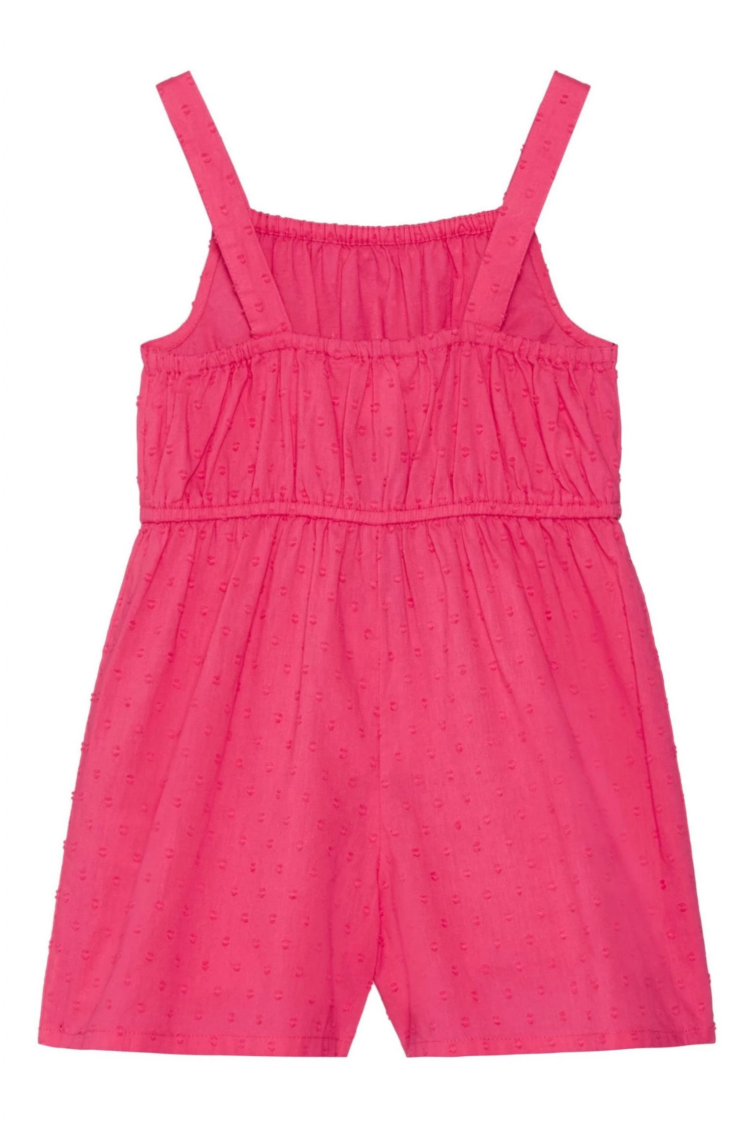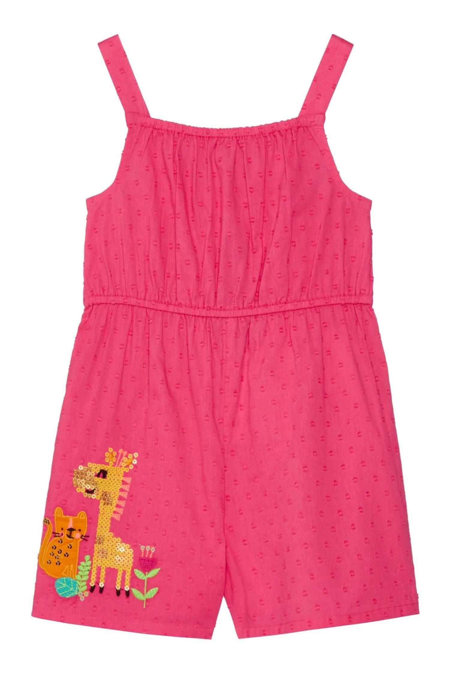 Cute and colourful, this girl s playsuit is a must for the warmer weather. In a pretty pink, this playsuit is made from a soft 100% cotton in a dobby style fabric featuring tropical style animal embroidery.