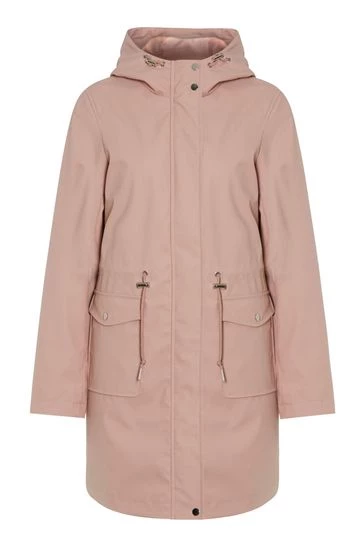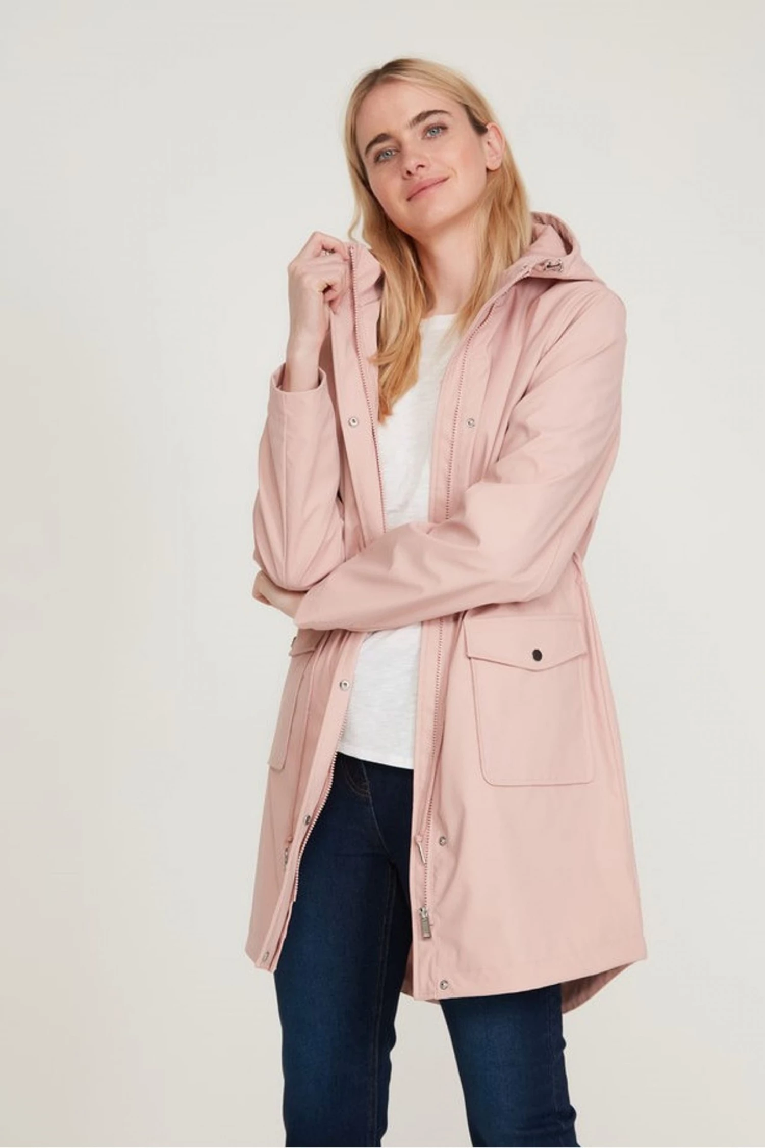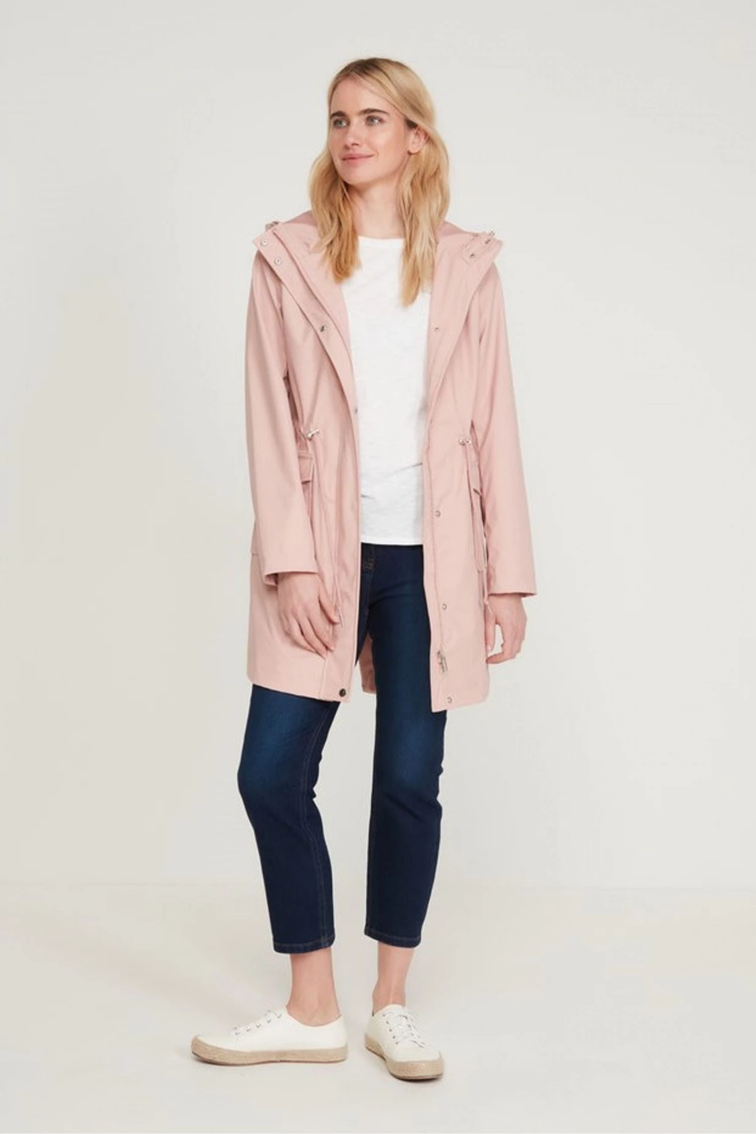 This raincoat is designed in a longline length and features a drawstring waist, long sleeves, classic hood, and side pockets with button closure. Layer over any outfit for an on-trend look, no matter the weather!