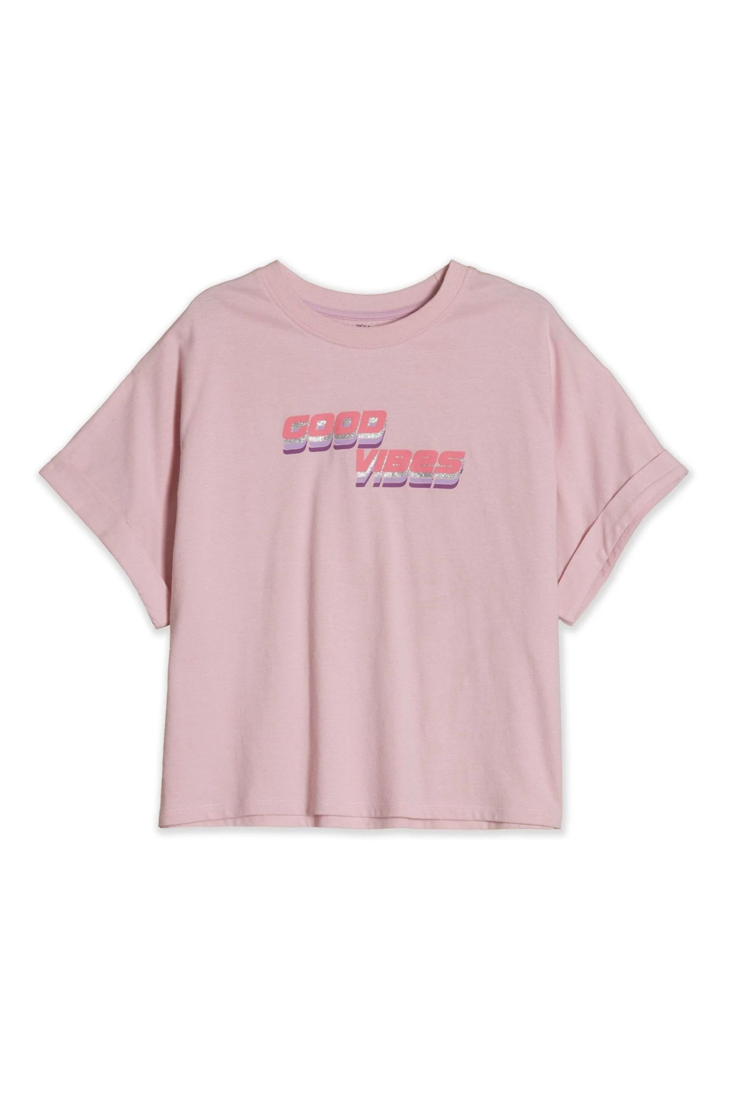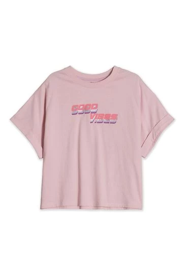 Good vibes only! This pale pink girls T-shirt is made in a soft cotton blend, featuring short turn up sleeves and a ‘good vides’ graphic. Pair with denim shorts and trainers for an easy everyday look she will love.
