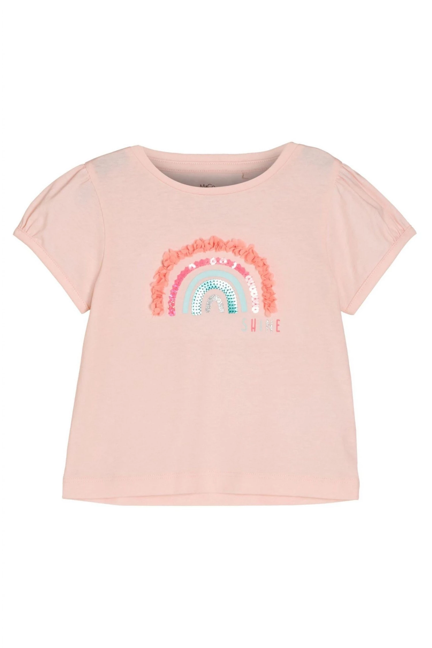 This 100% Cotton jersey T shirt with ruffle and sequin embellished design in short puff sleeves and crew neck. Ideal paired with denim shorts and sandals.