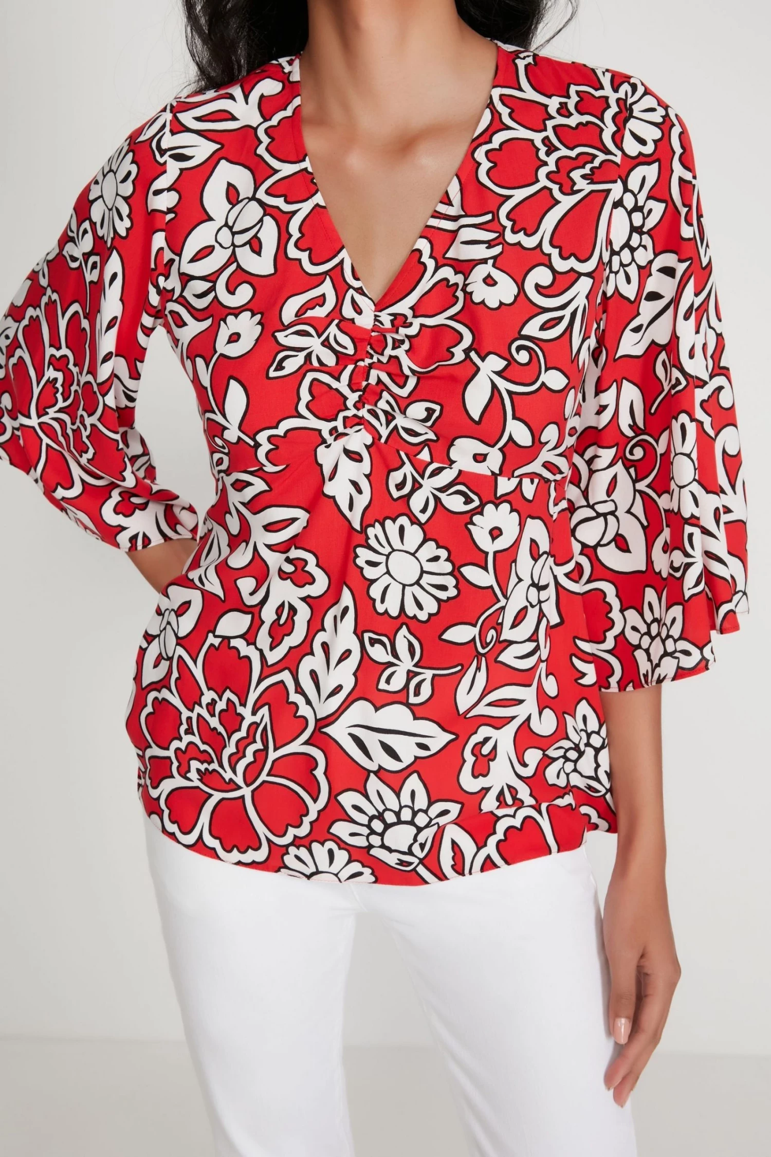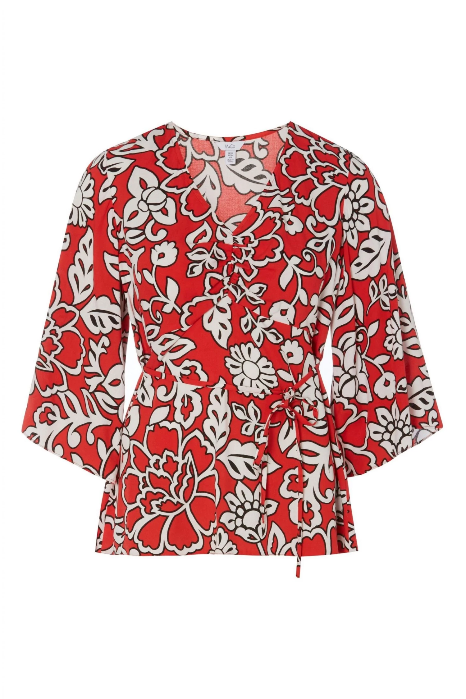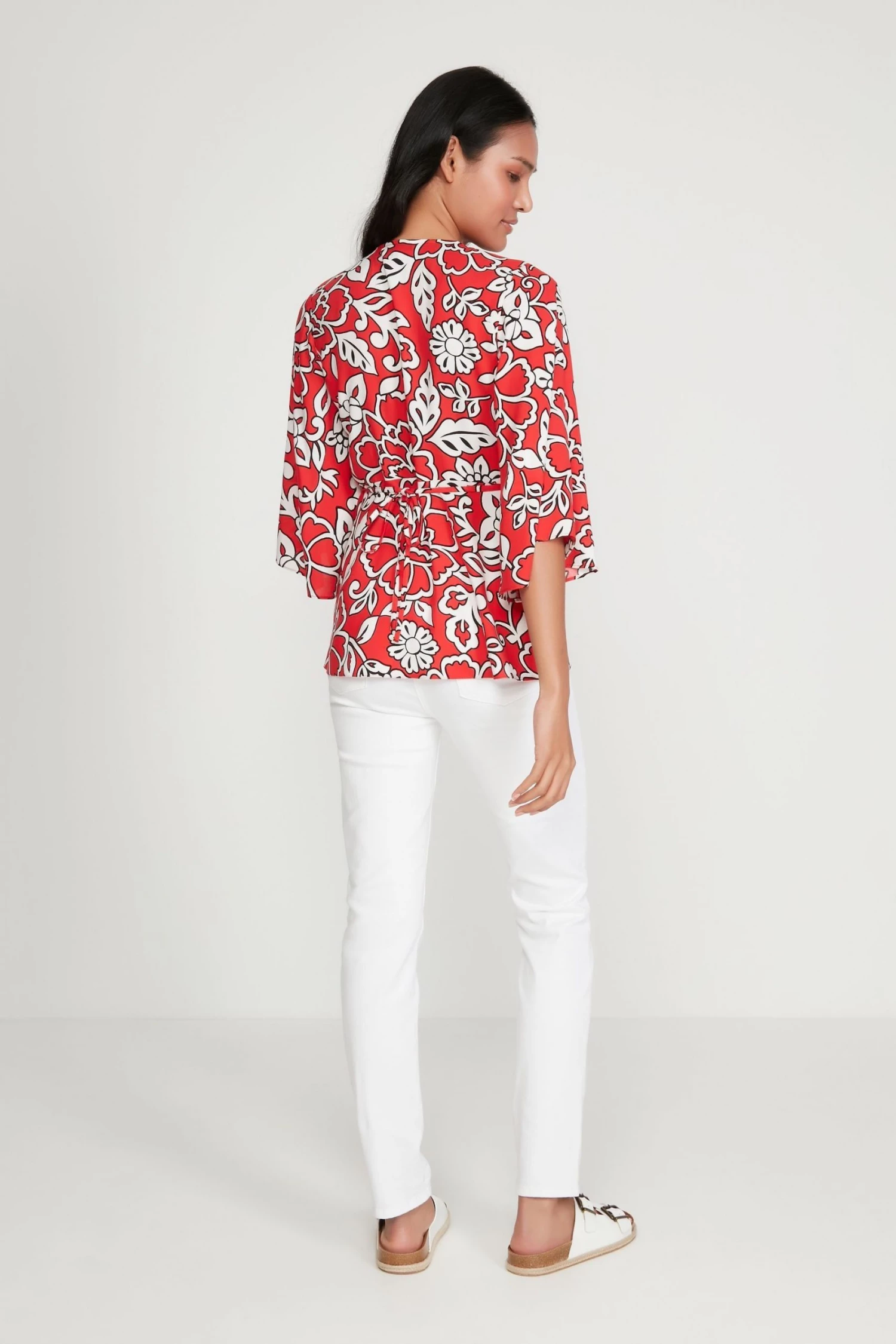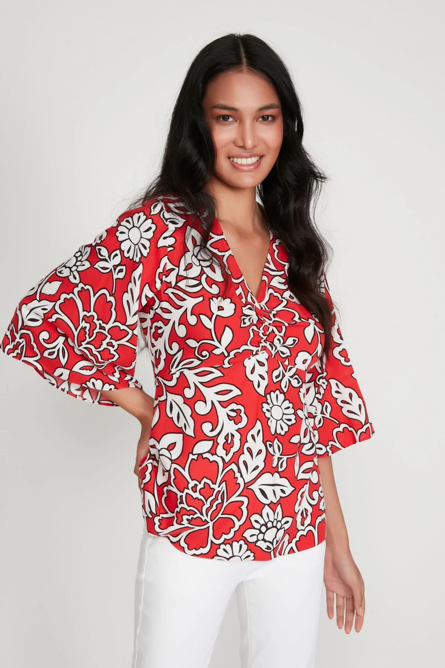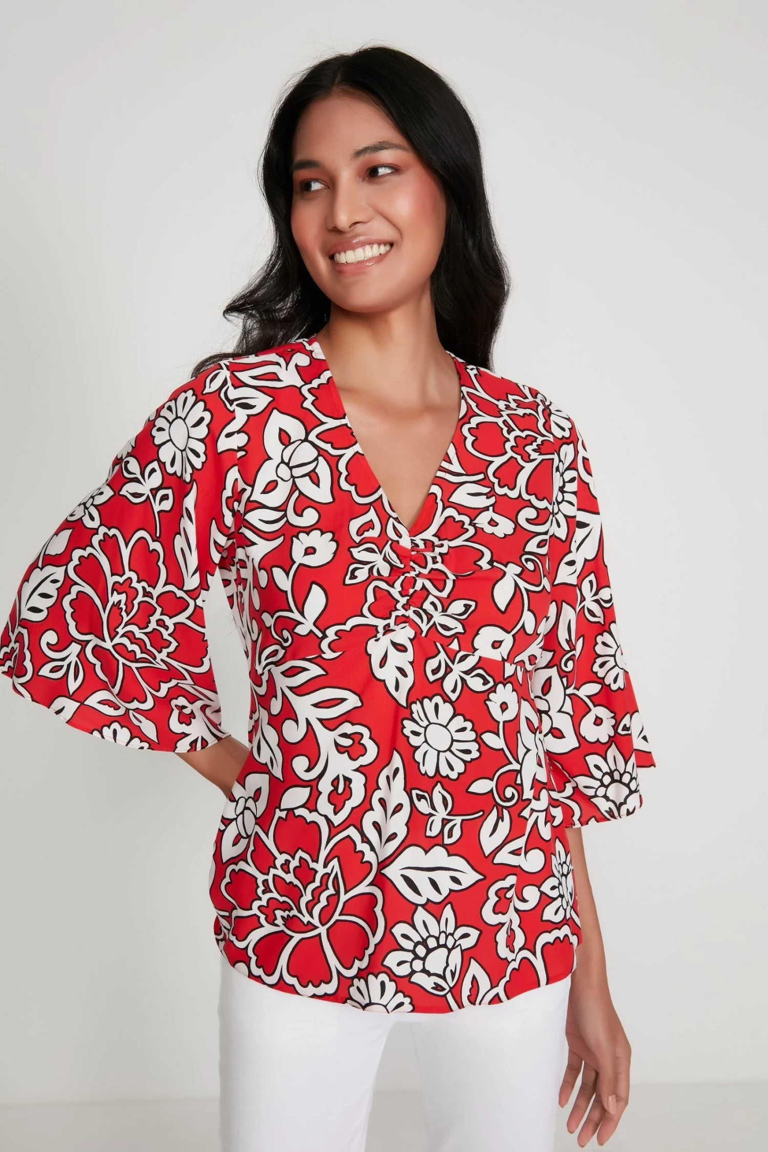 Stay on trend this season with this red floral top. This flattering design features flowing 3/4 sleeves, a ruched neckline and tie waist detailing. Pair with jeans and heels for the perfect evening look.