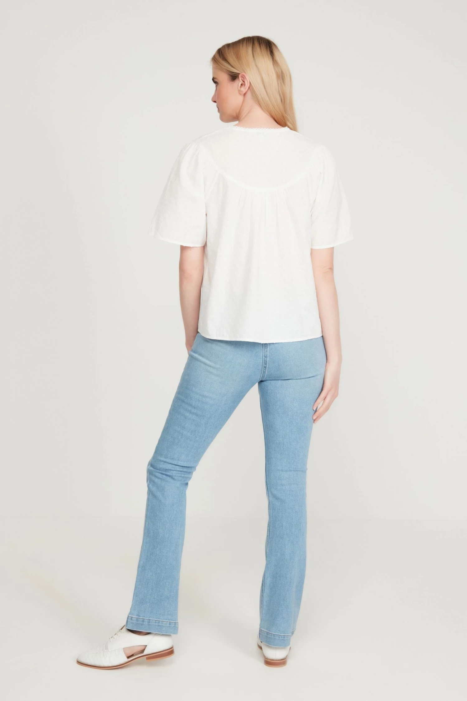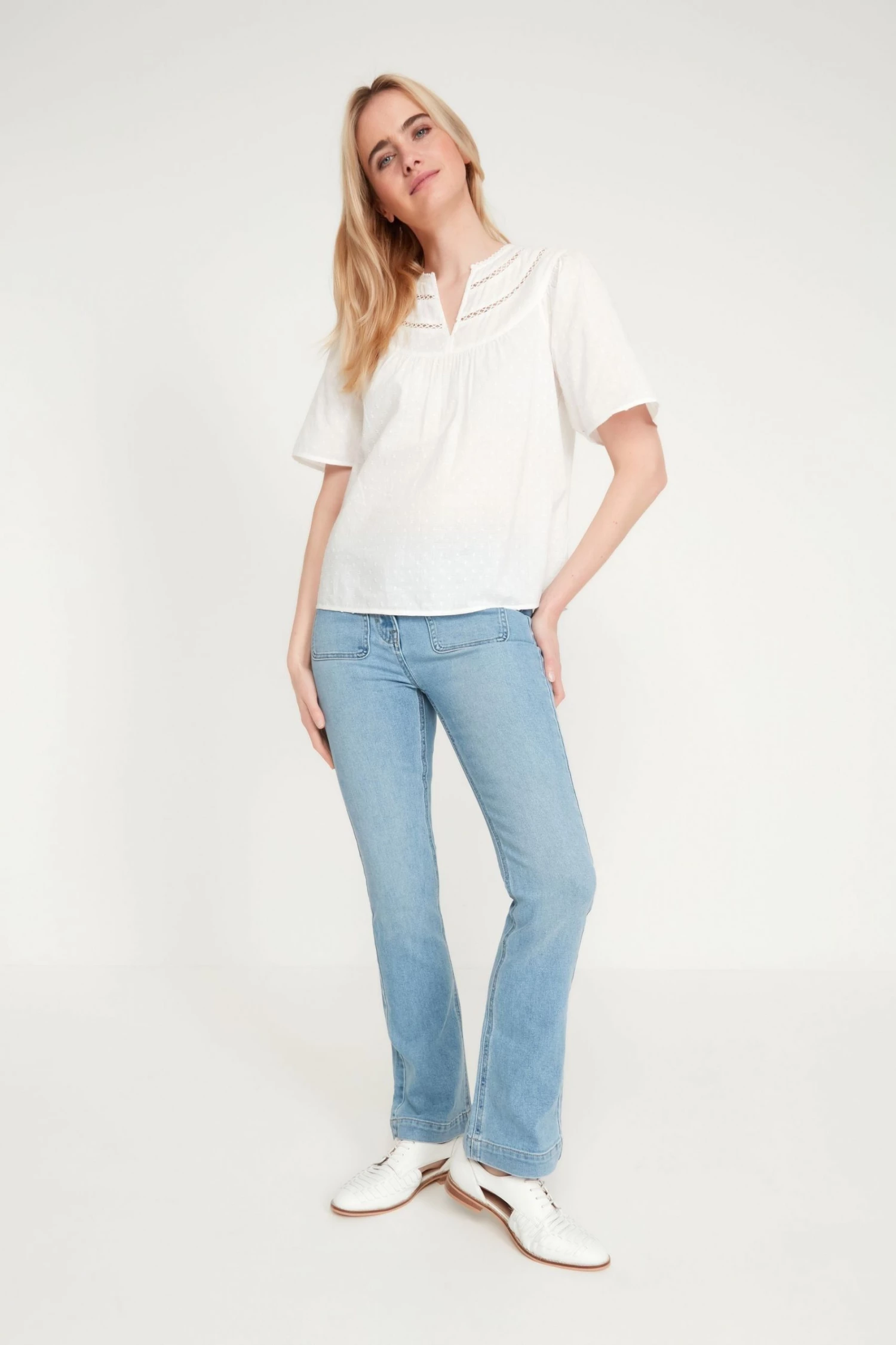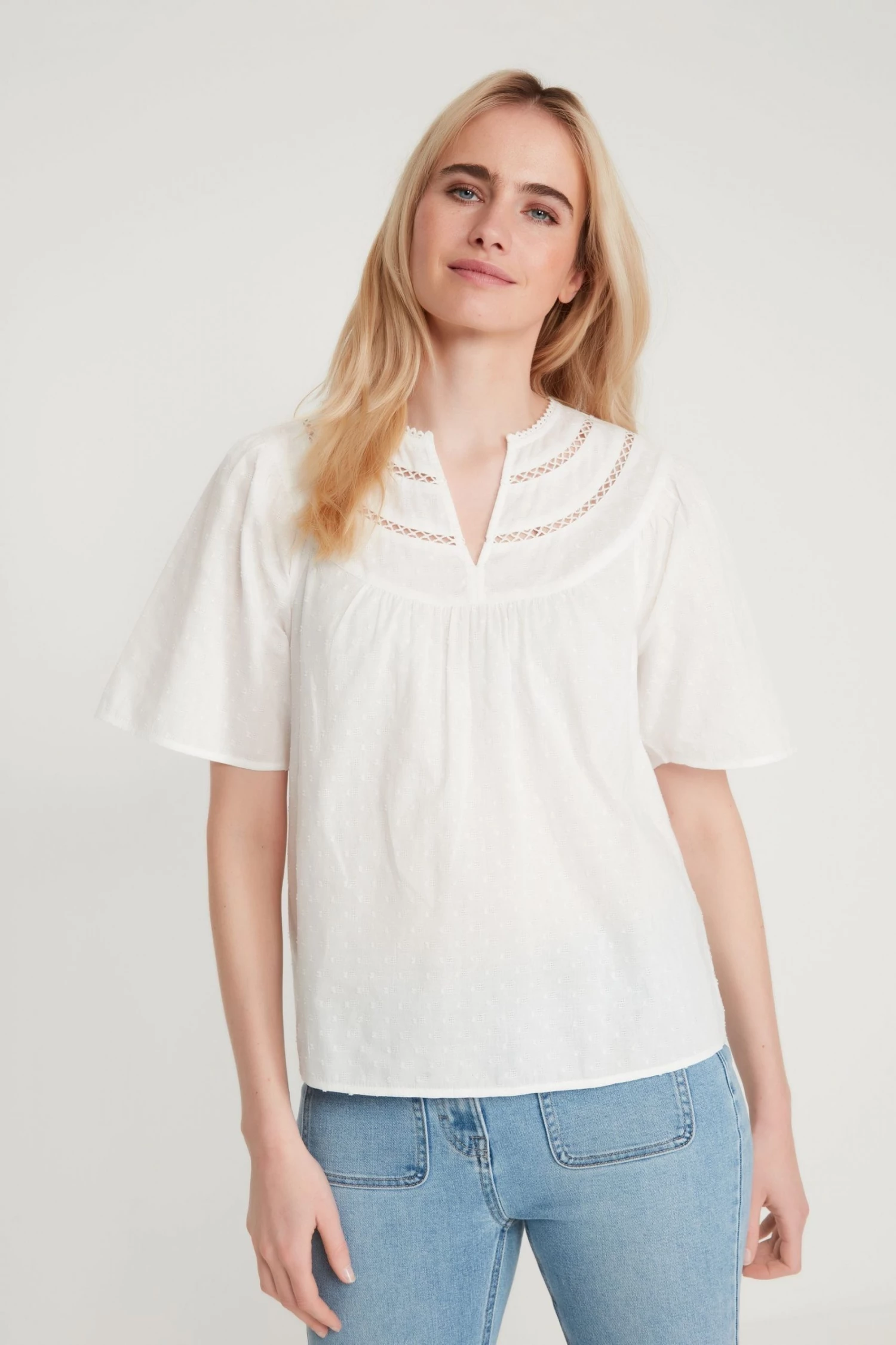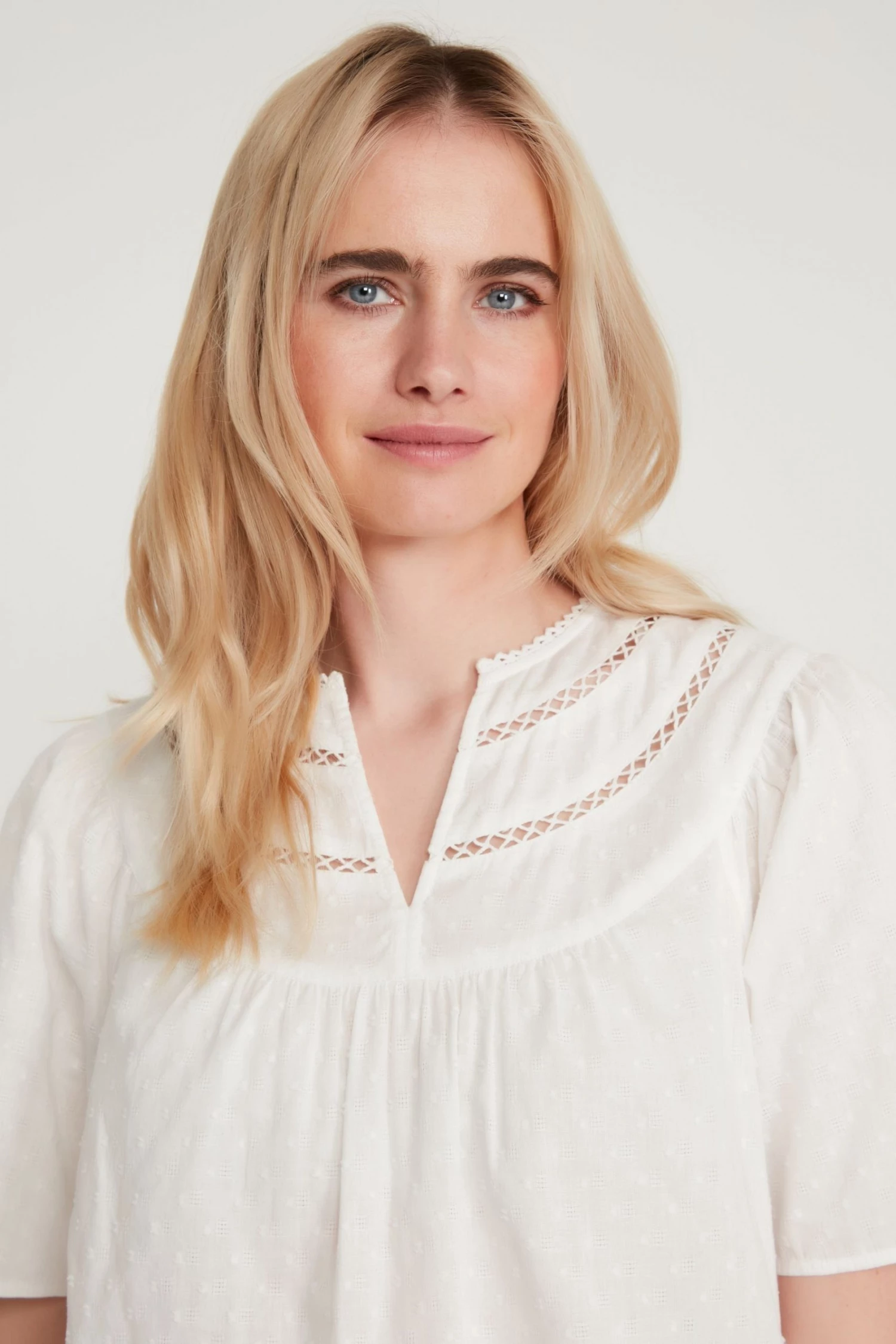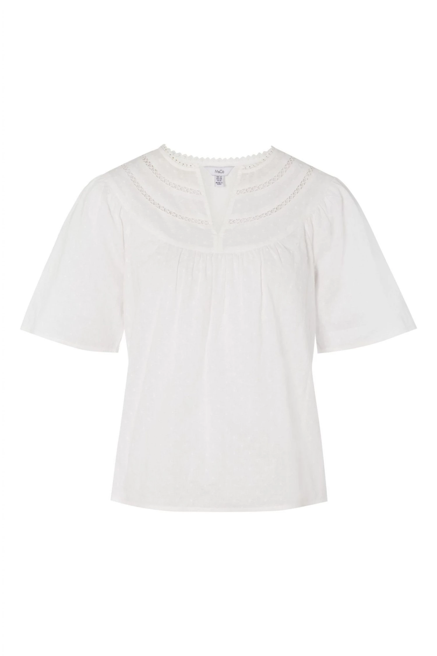 Update your wardrobe for the new season with this delicate blouse, feature short sleeves, a notch neckline and lace trim detailing. Pair with jeans and sandals for a stylish everyday look.