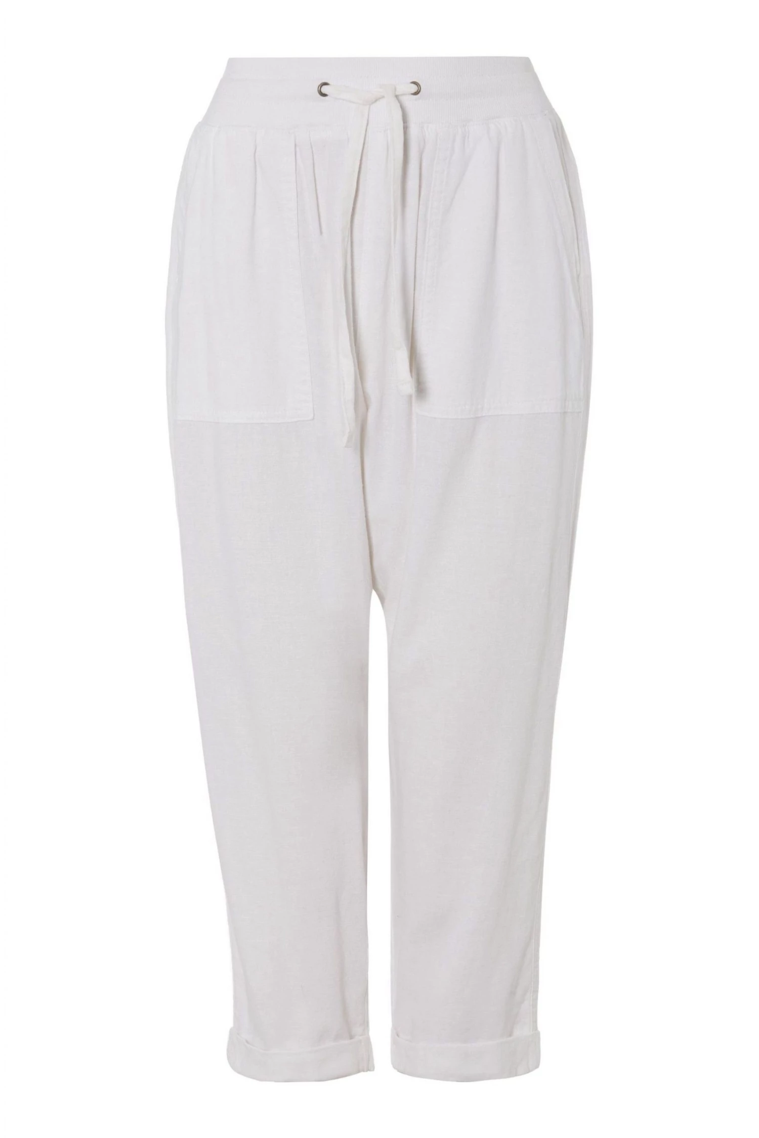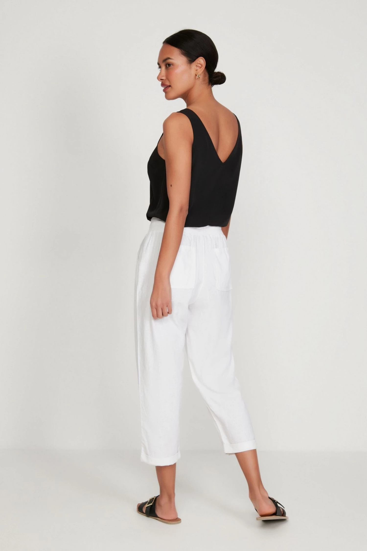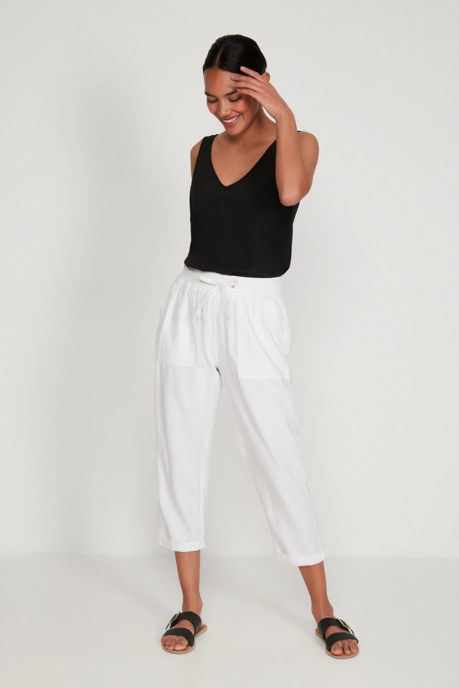 Update your wardrobe for the new season with these black cropped linen trousers. Featuring an elasticated waistband with drawstring detailing, side pockets and turn up hems. Pair with a T-shirt and sandals for an easy summer look.