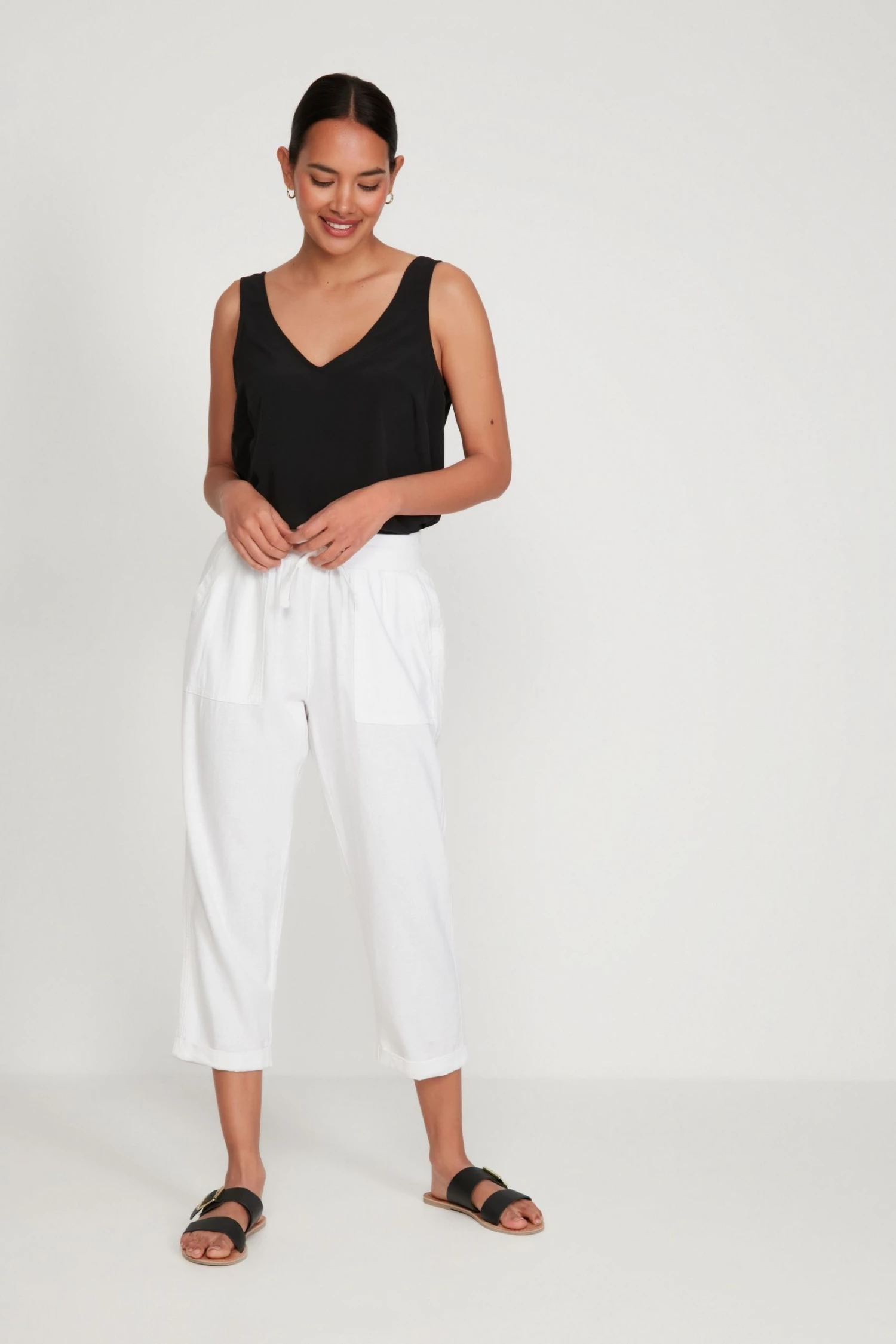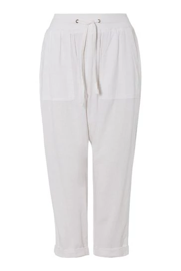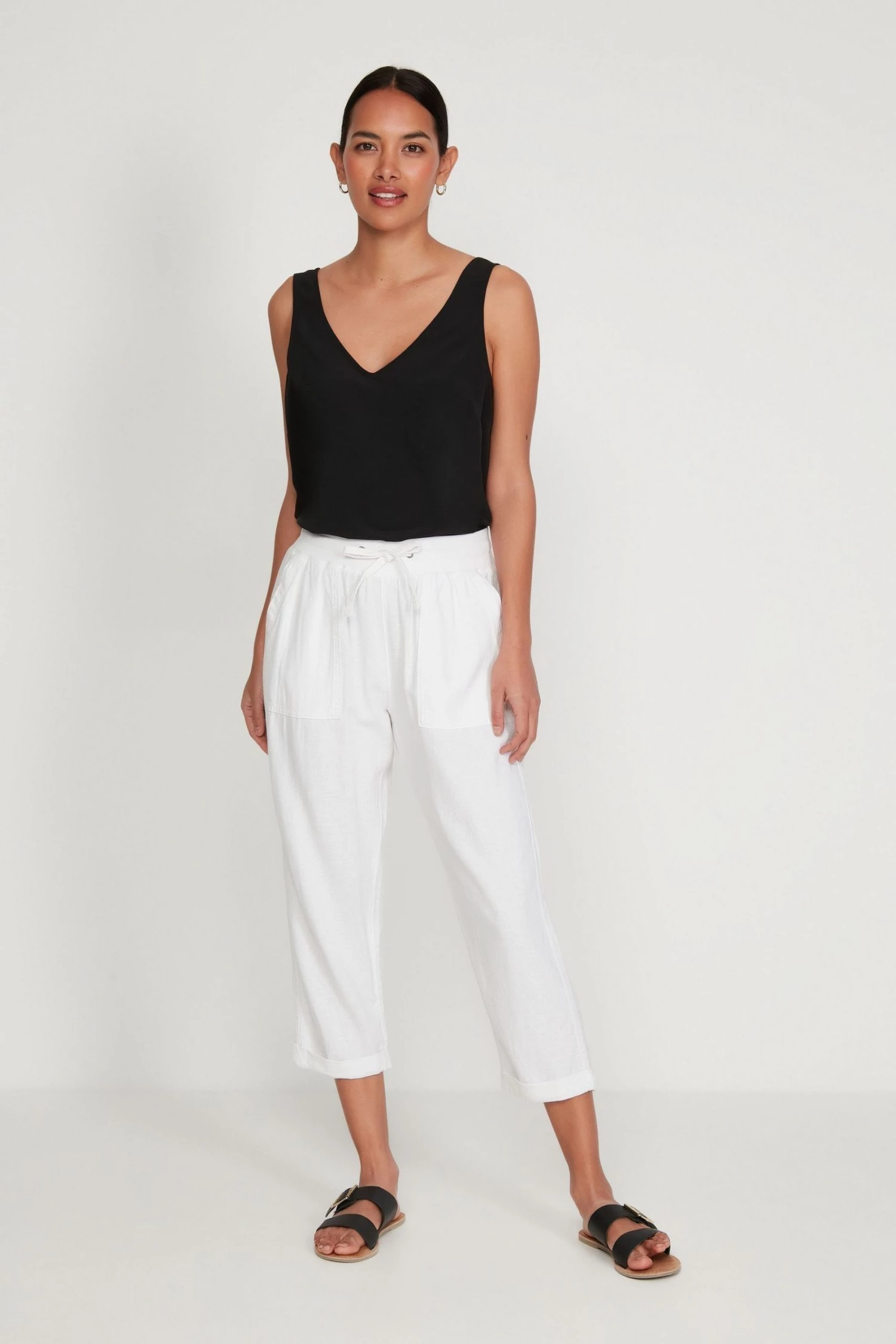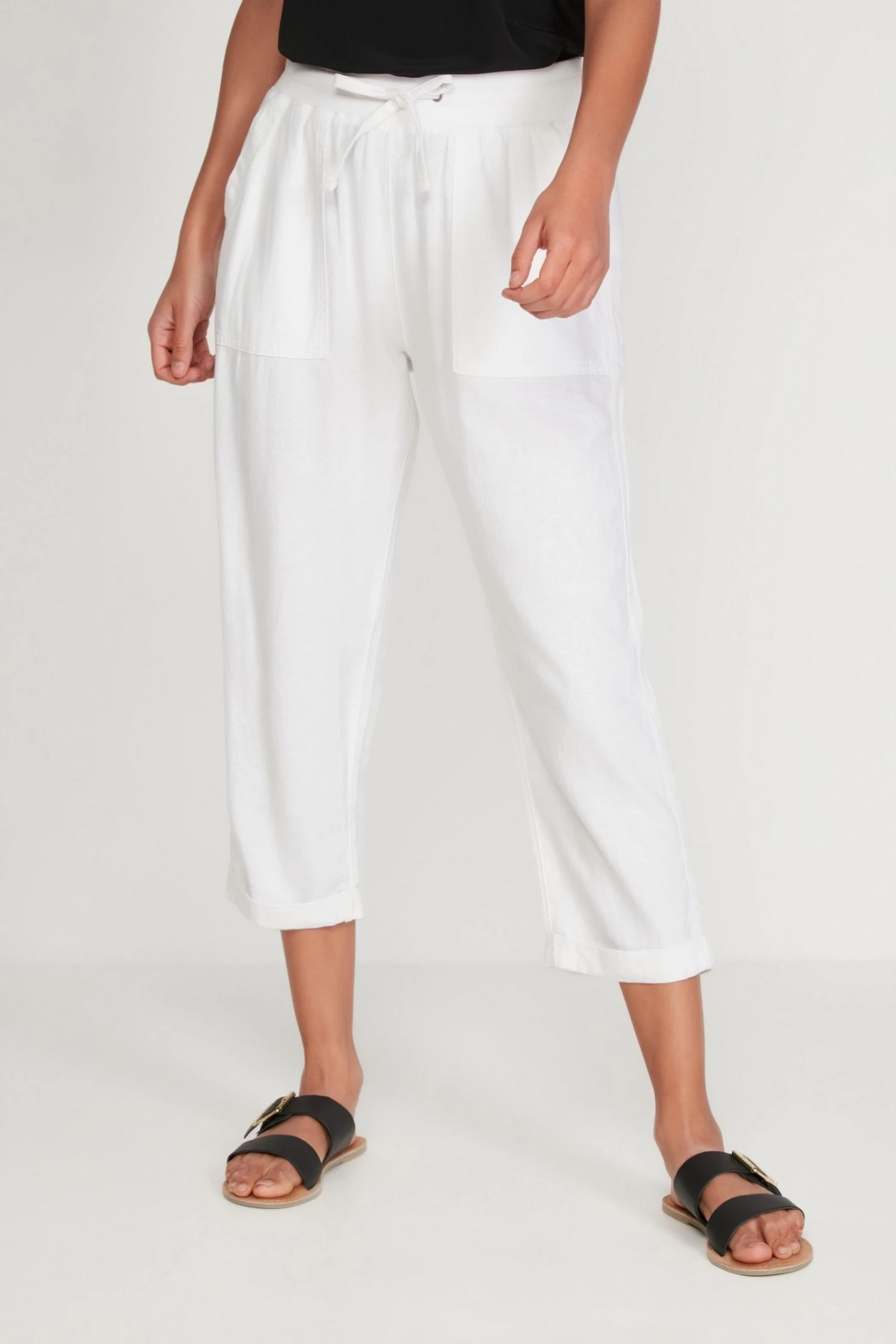 Update your wardrobe for the new season with these black cropped linen trousers. Featuring an elasticated waistband with drawstring detailing, side pockets and turn up hems. Pair with a T-shirt and sandals for an easy summer look.