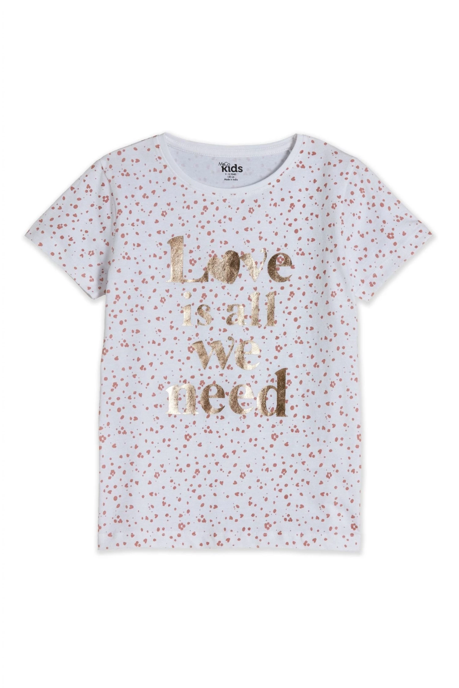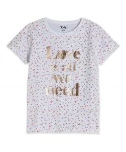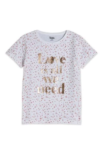 A white T-shirt with ‘love is all you need’ slogan on front. Style her in denim shorts and trainers for a comfortable everyday look.