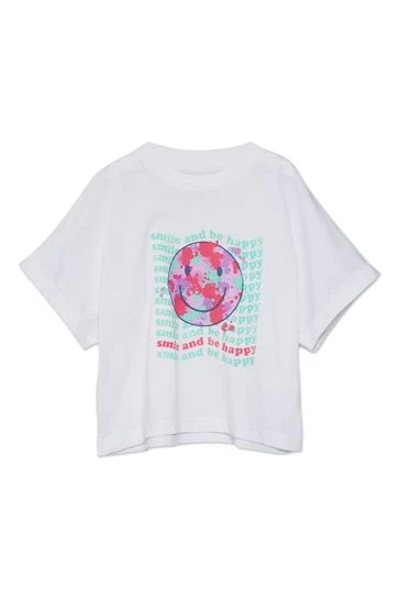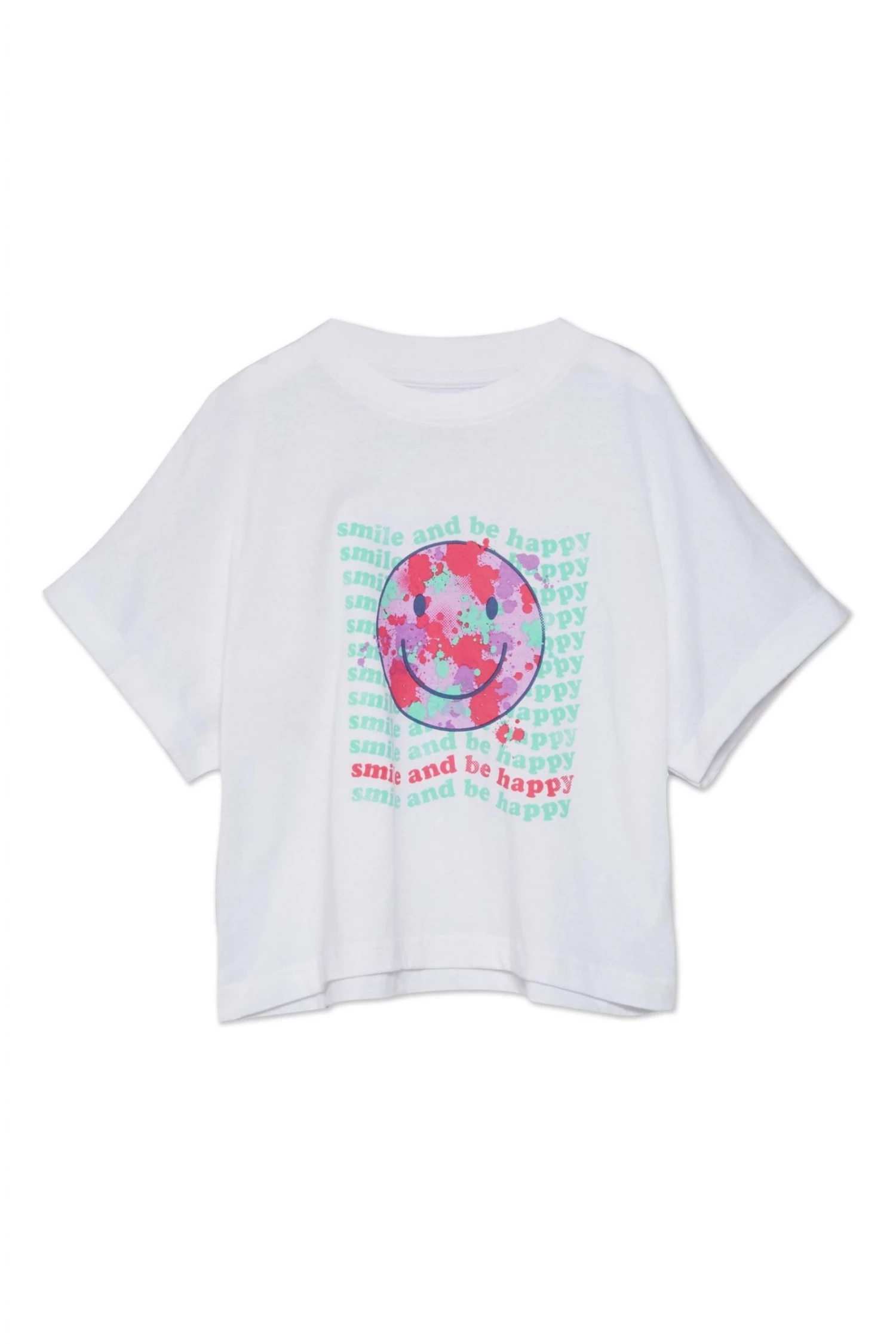 This girl s t-shirt is crafted from a soft jersey fabric and features short sleeves, a crew neckline and smile and be happy slogan with face design.