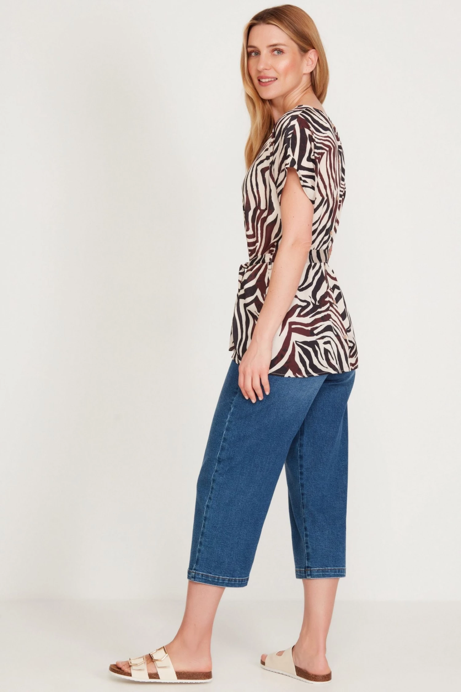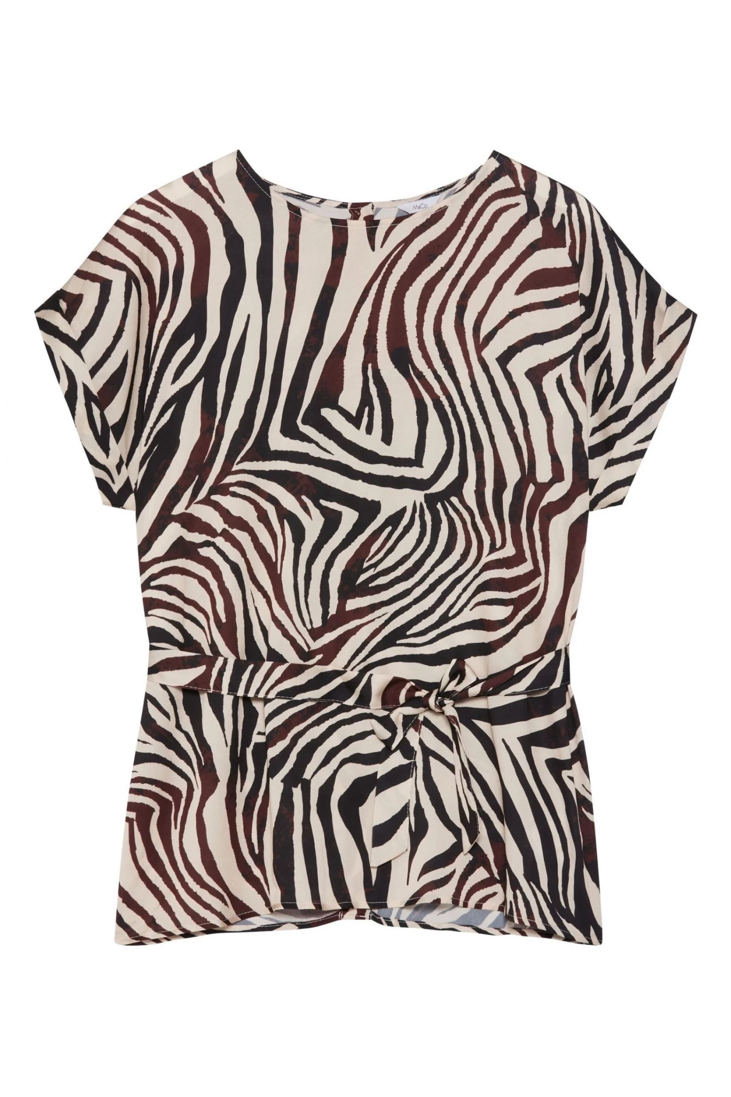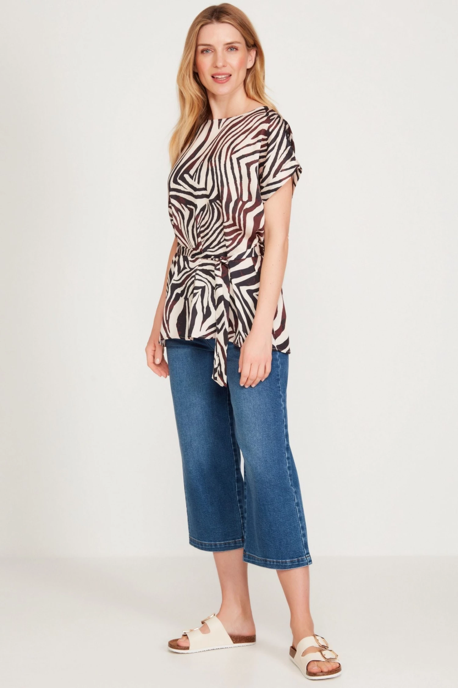 This satin top has been designed in a trendy zebra print with tie waist detailing and a bubble hem. Style with black skinny jeans and heels for an evening look or switch to sandals for daytime.